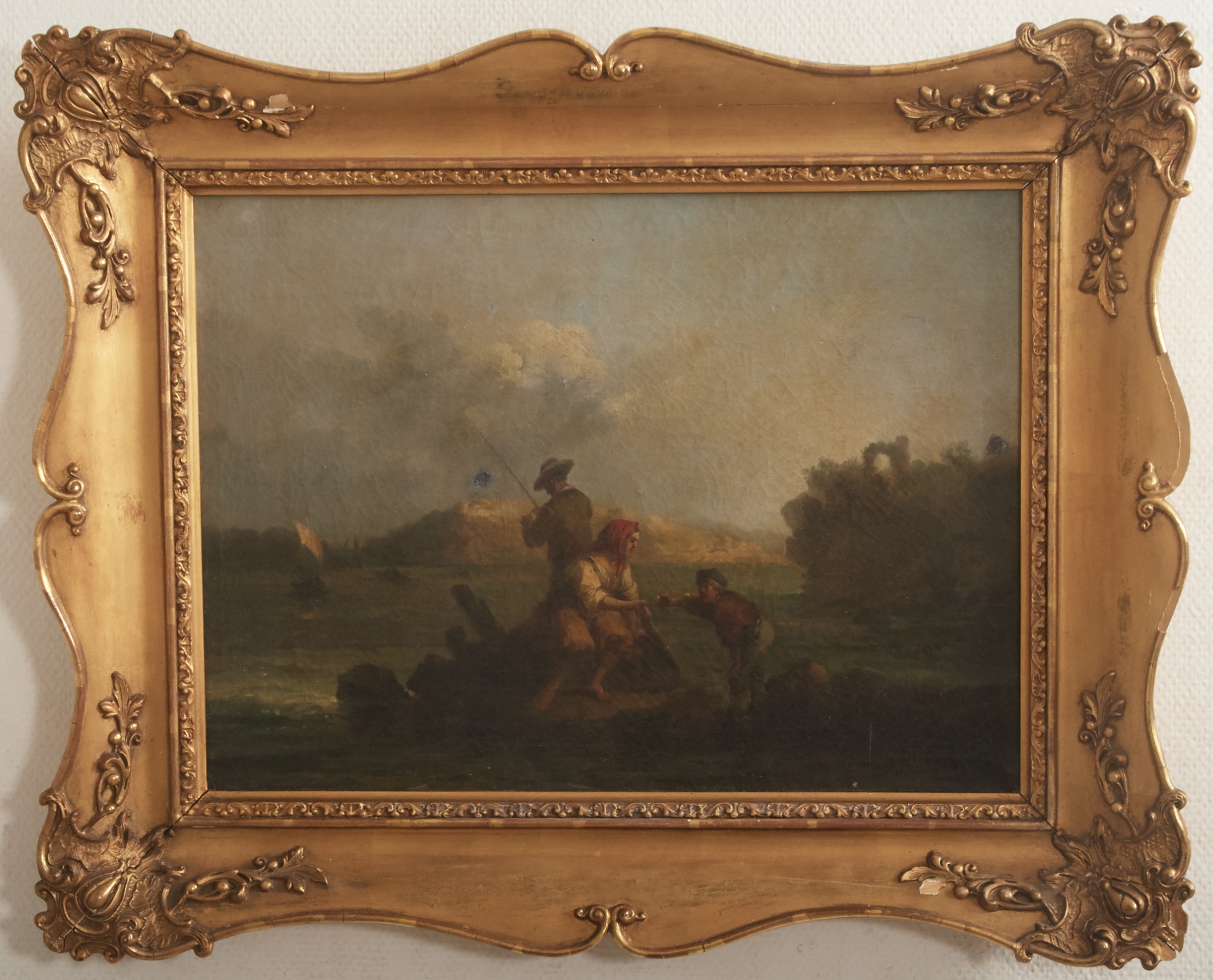 Naturmotiv med figurer, otydlig signatur, 40 x 54 cm, krackelerad duk, retuscher