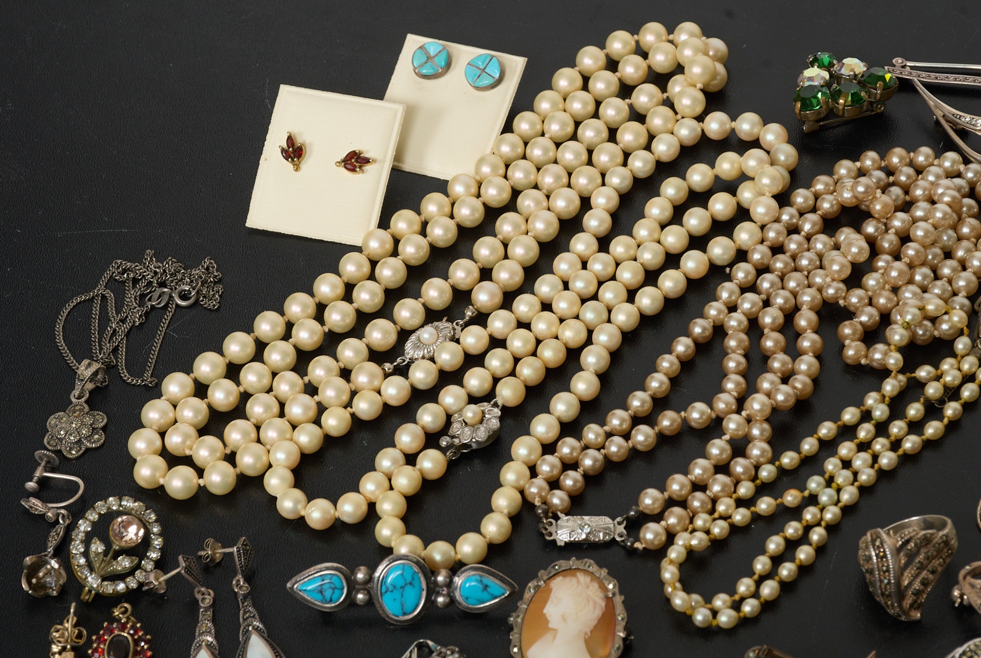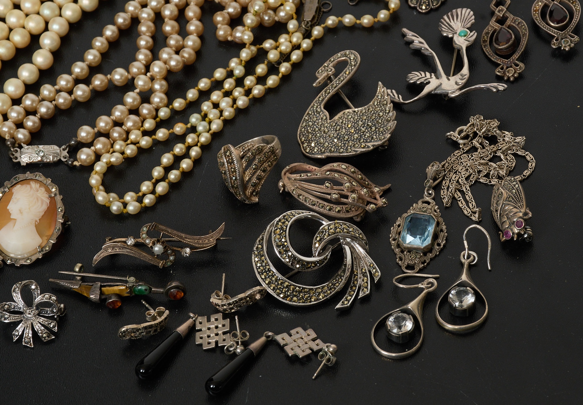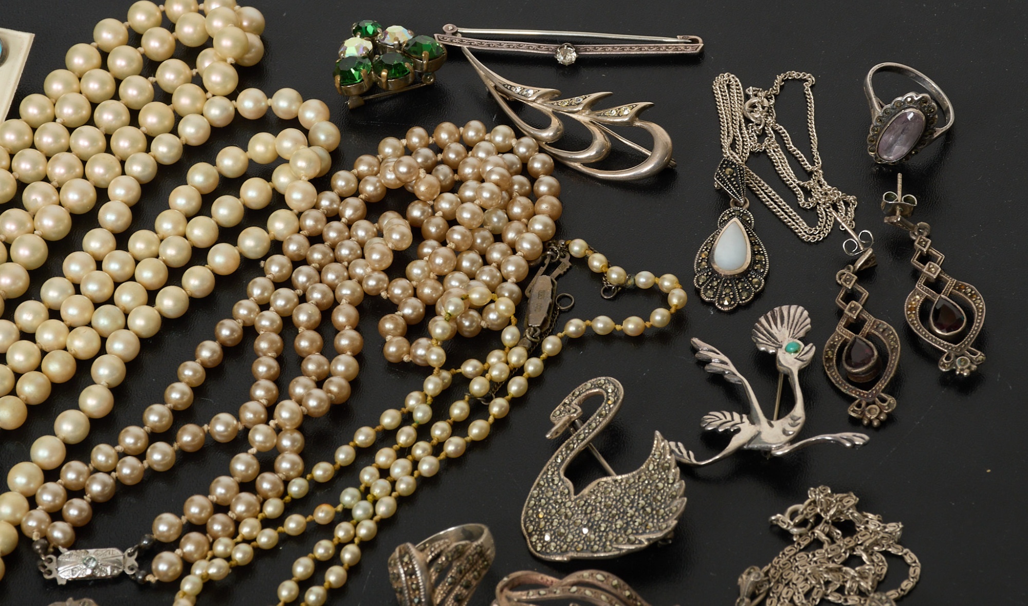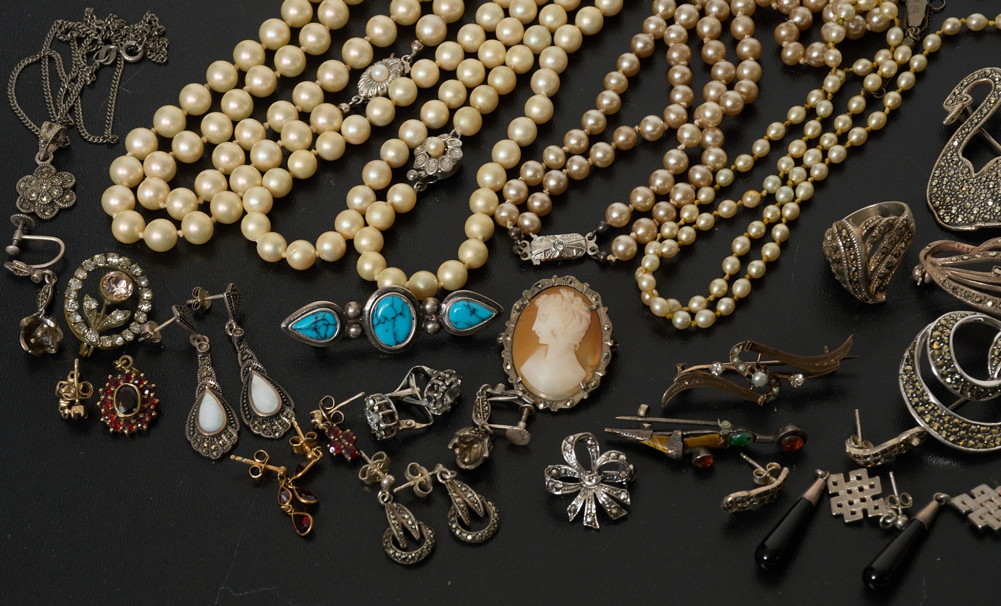 Mestadels silver, äldre, samt nyare, camebrosch, pärlhalsband m.m.