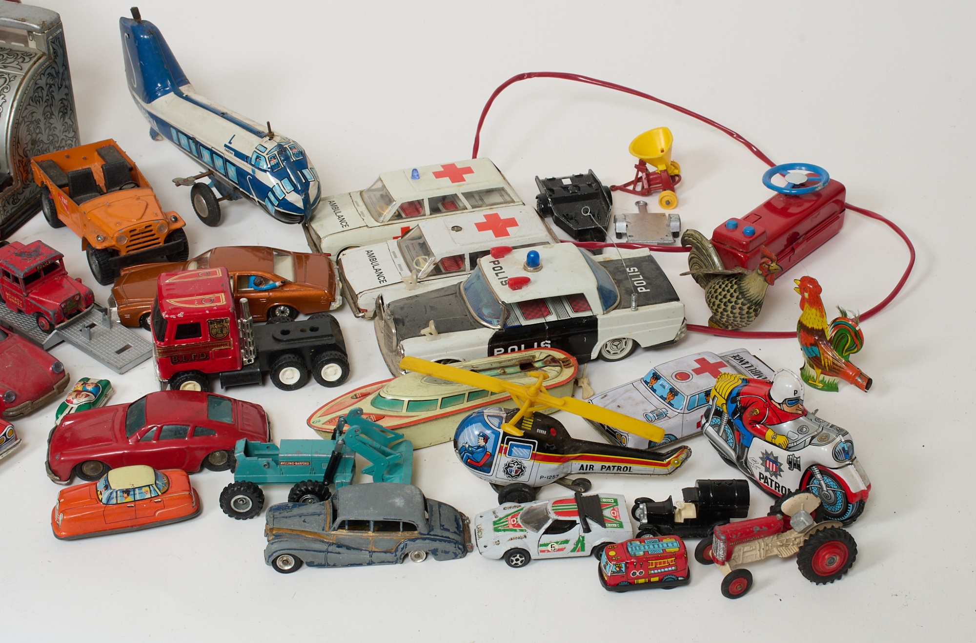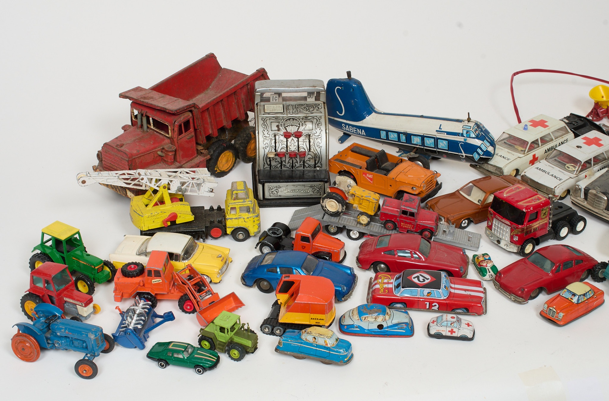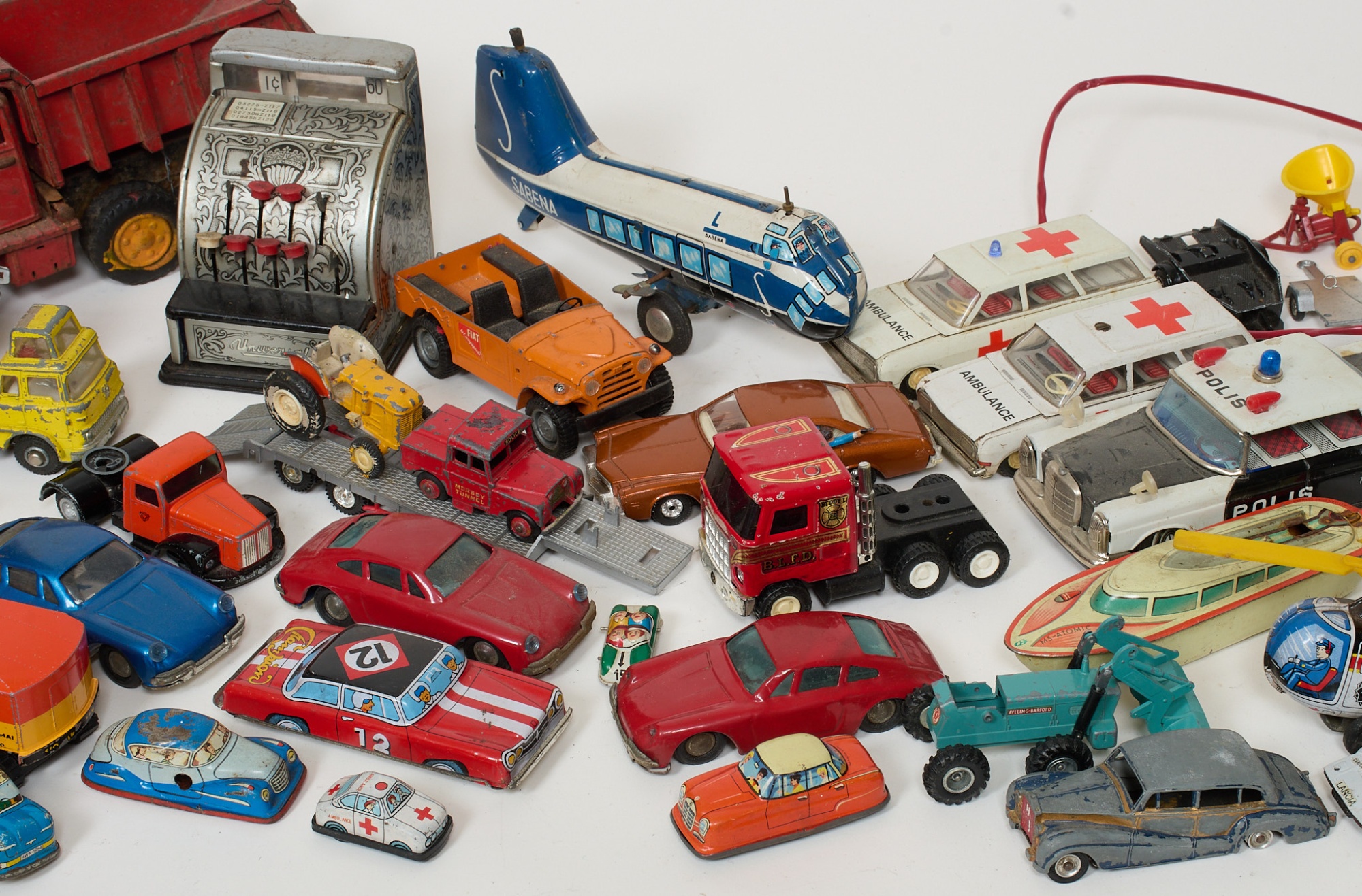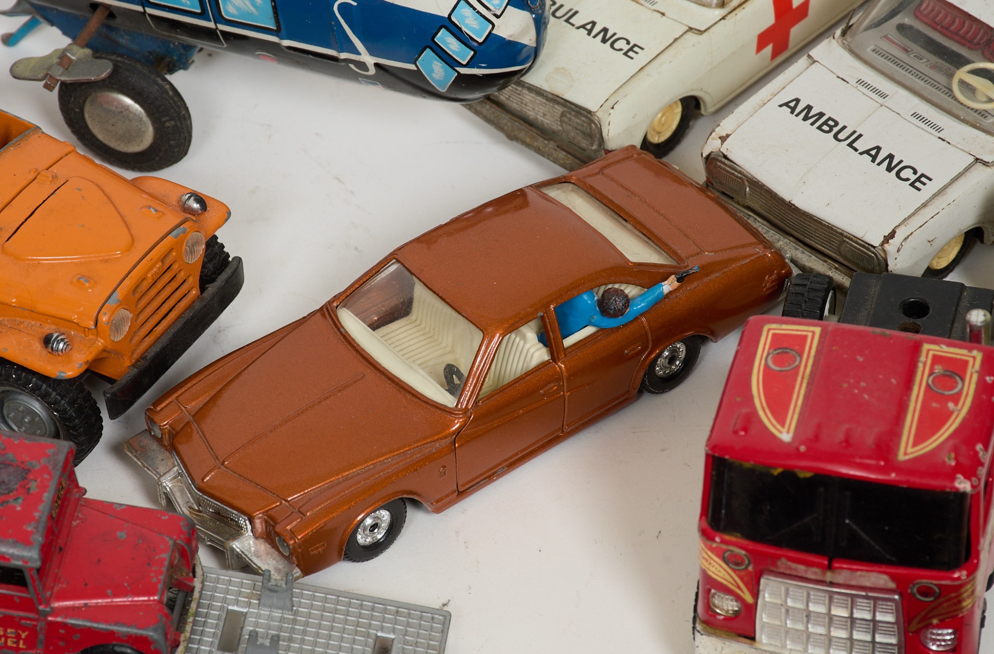 Plåt/metall, Tekno, Lesney, Dinky, Corgi. Blandad kvalite, slitage, skador.