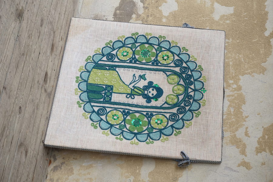Flickan i buren, handsydd tavla. B160
