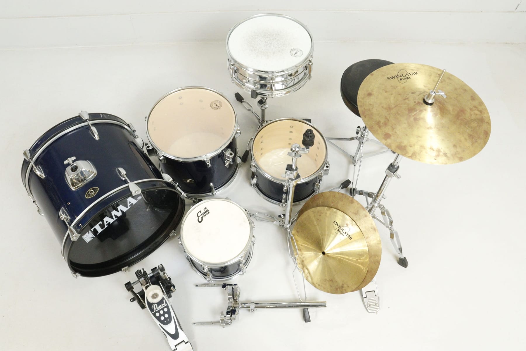 Bilder Trumset, Tama stagestar 12, 13, 14 och 20, Virvel, Hi-hat, crash, cymbal med stativ, kickpedal och pall
