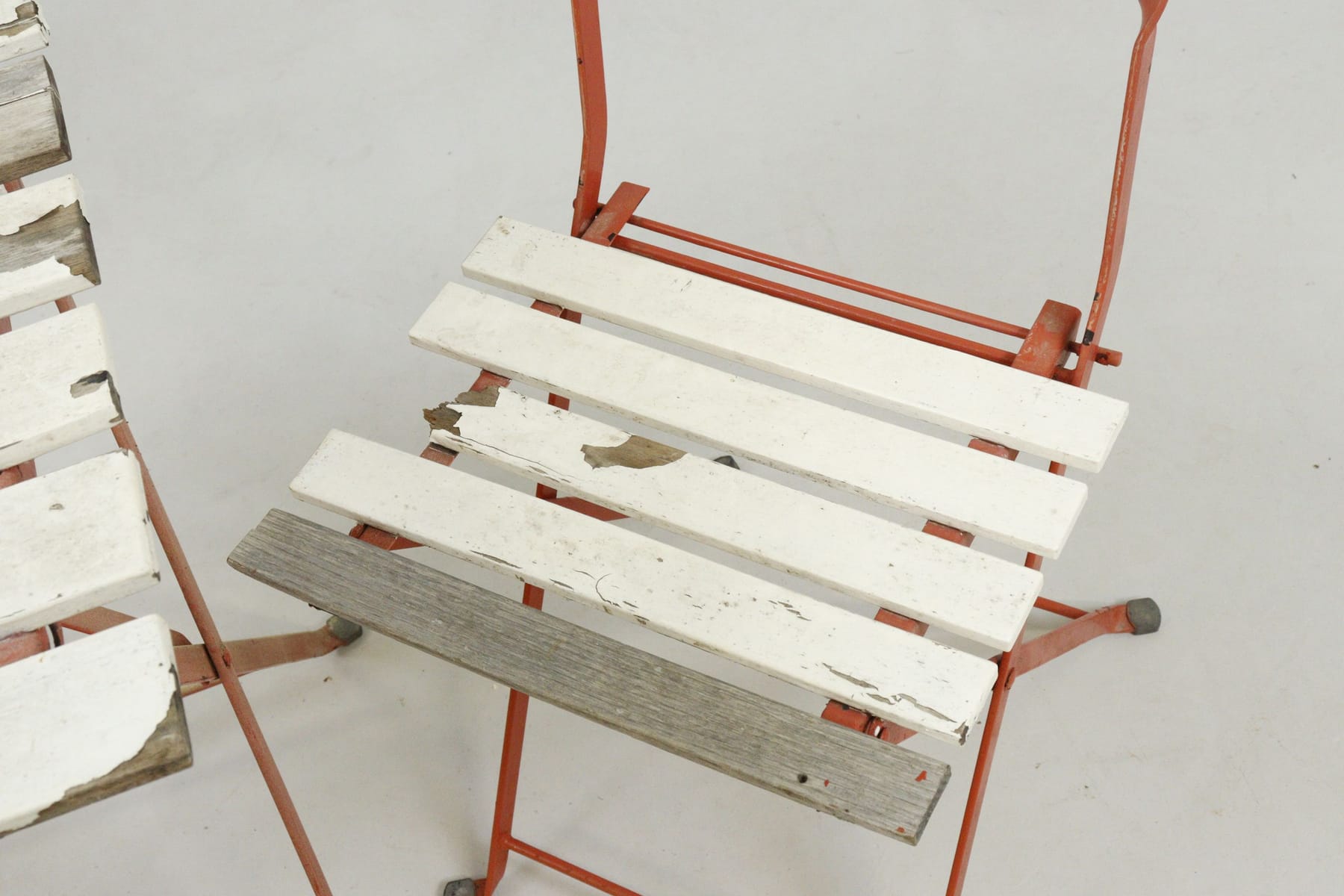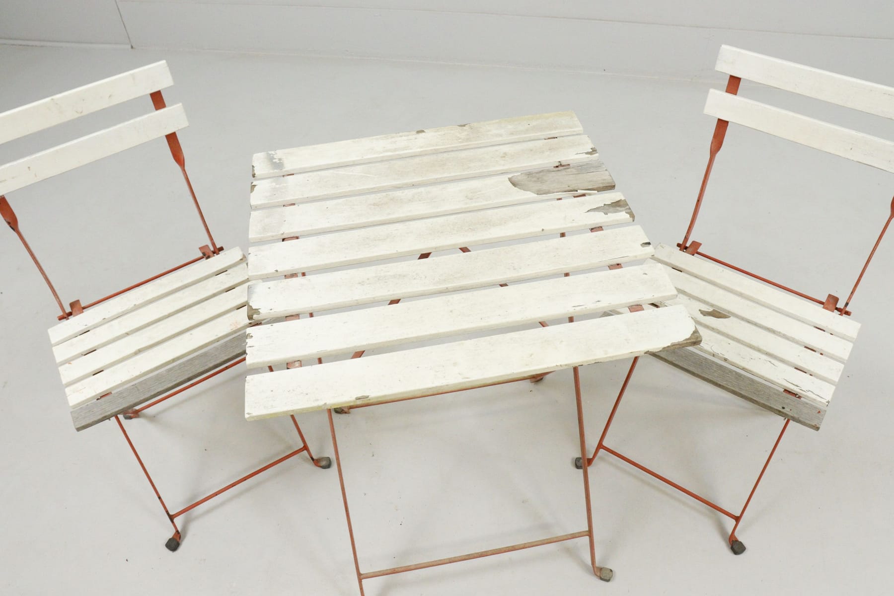 Trädgårdsbord med 2 stolar, rött metallstativ