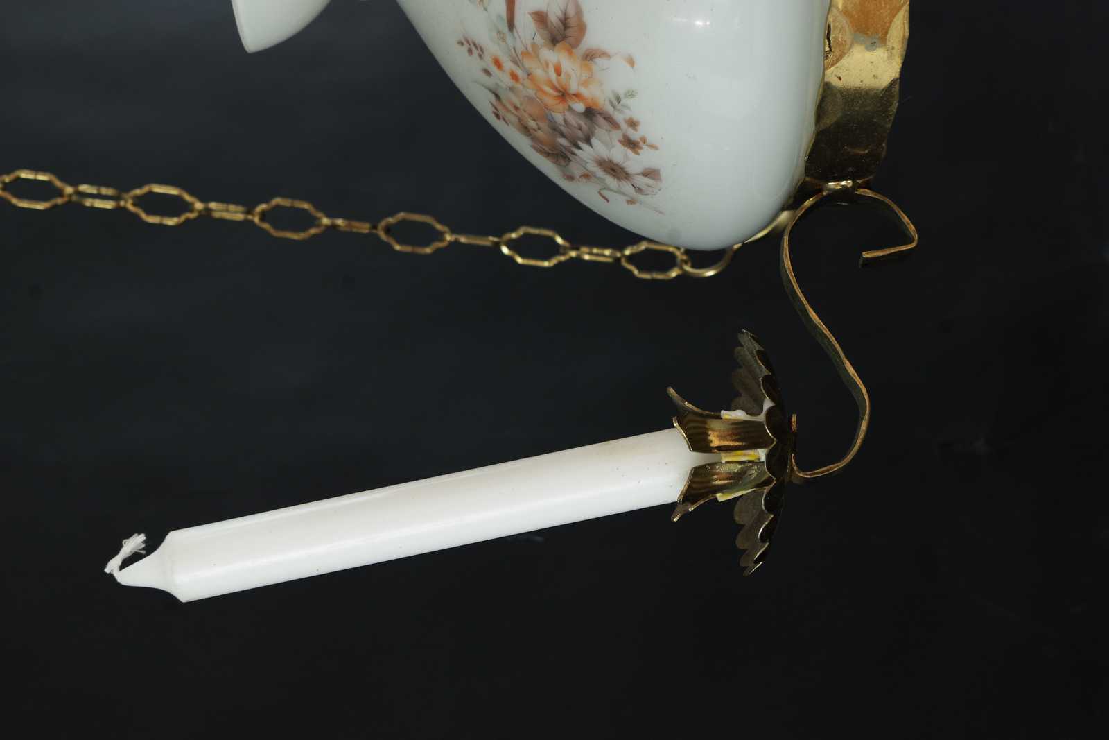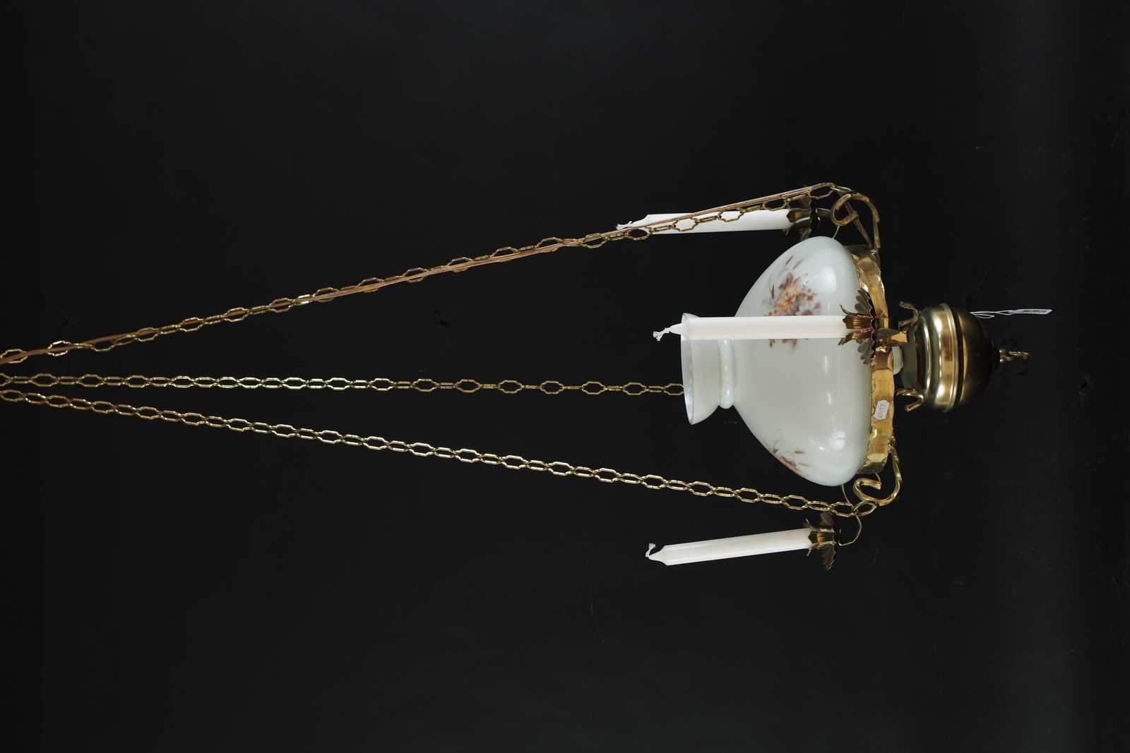 Bilder TAKLAMPA 3 armar för levande ljus, en elektrisk ljuspunkt, kupa i glas, 1900 talets andra hälft. D:44cm