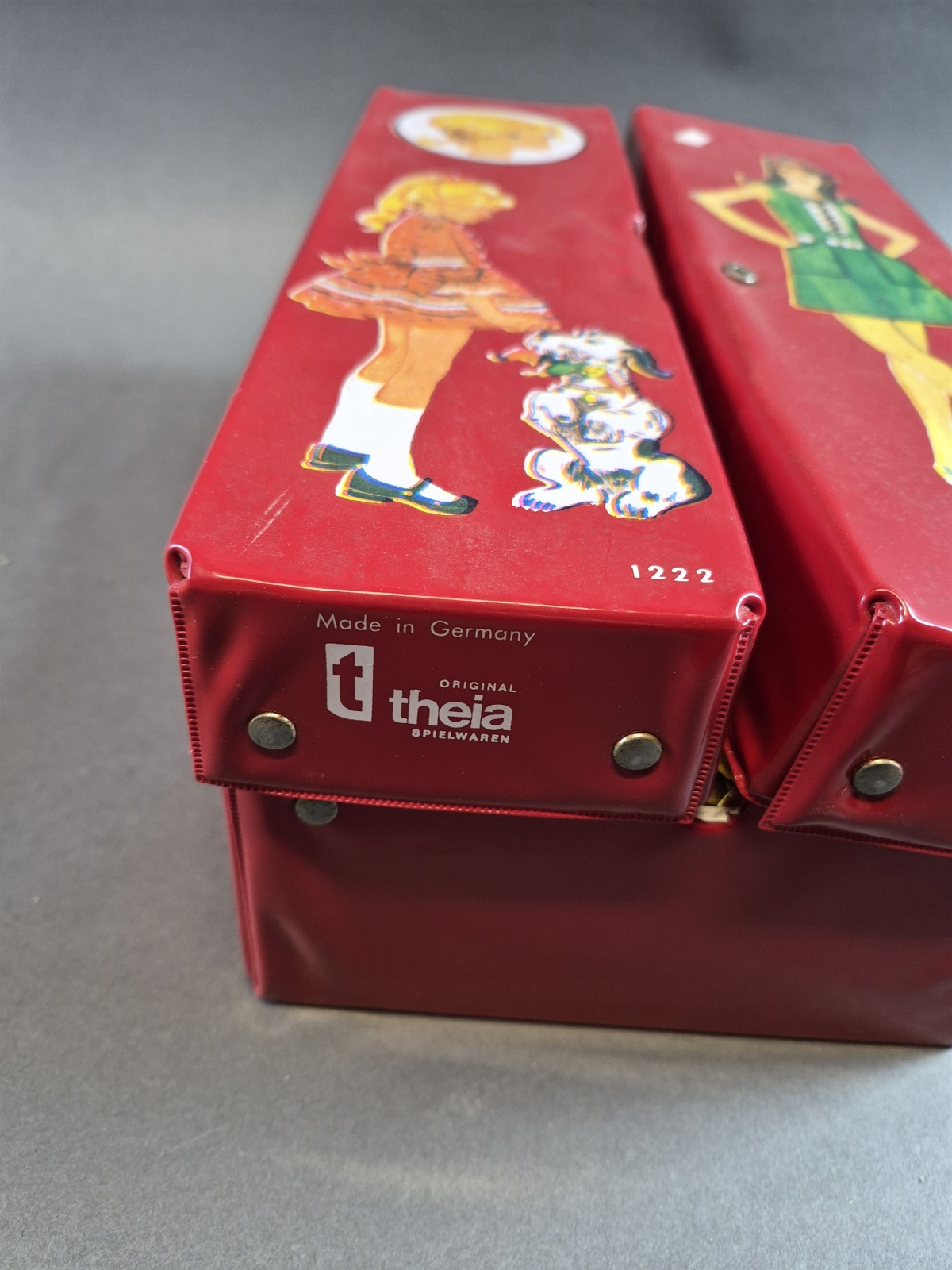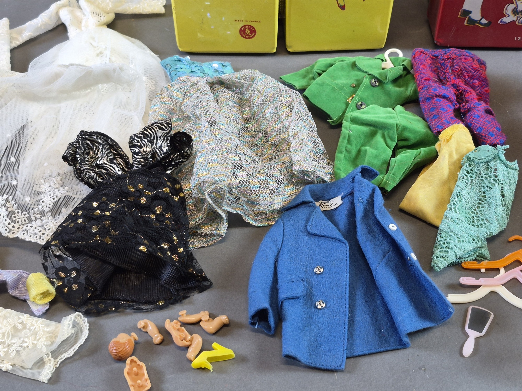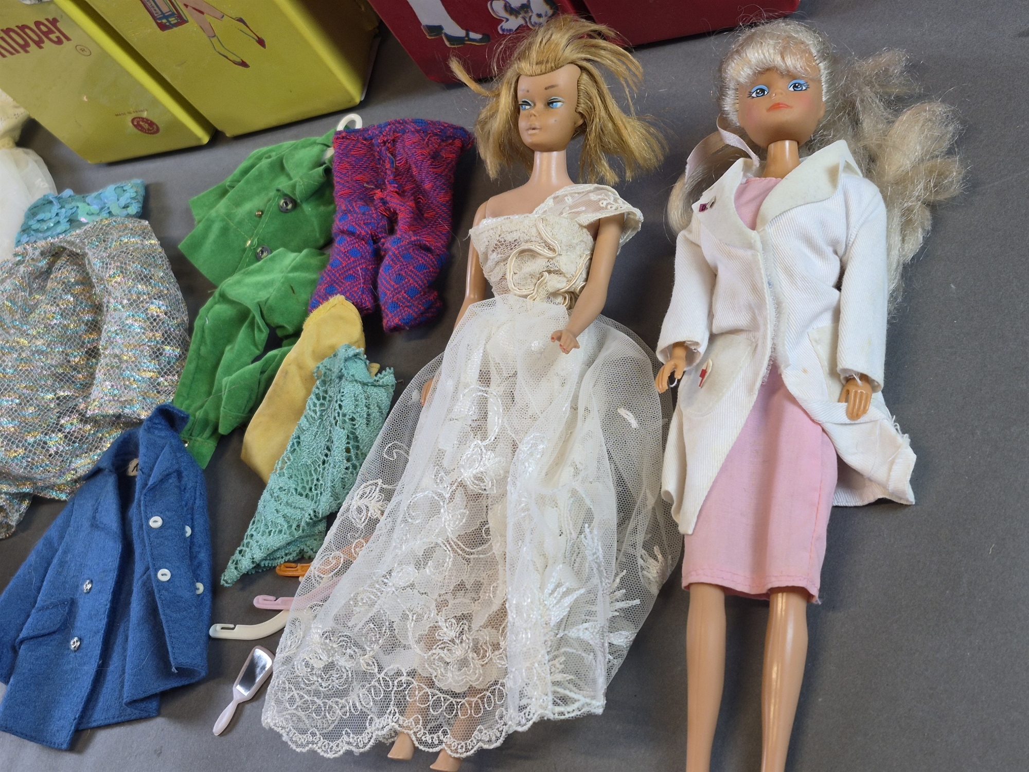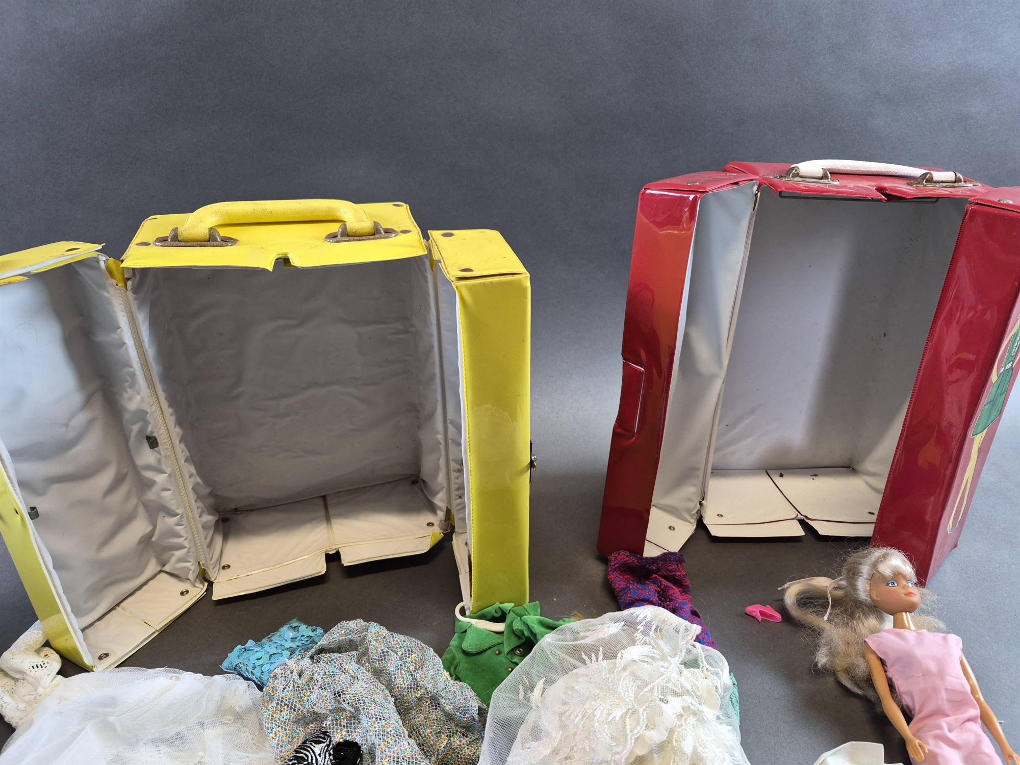 Bilder Förvaringslådor Mattel och Theia med dockor och docktillbehör bla Barbie, lukt och defekter finns, högsta höjd 31 cm