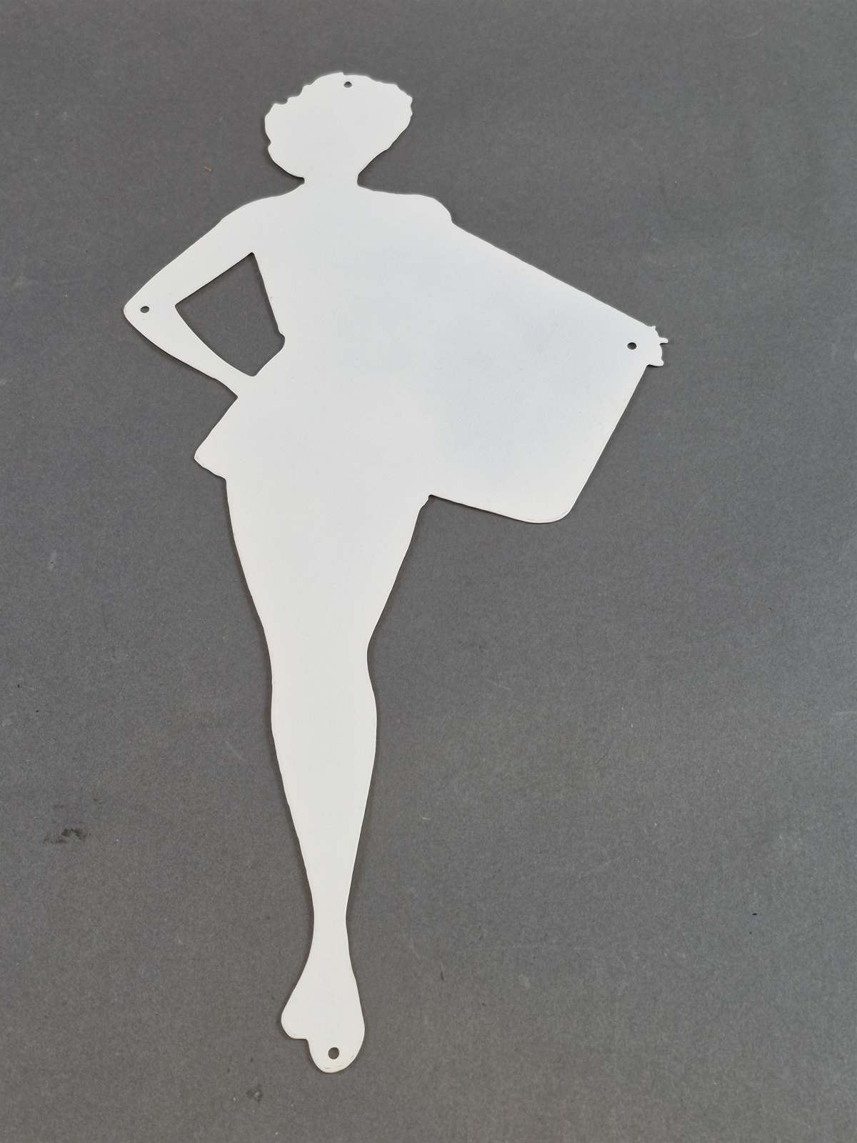 Plåtskylt Pinuppa, Kvinna, senare tillverkad, höjd 40 cm