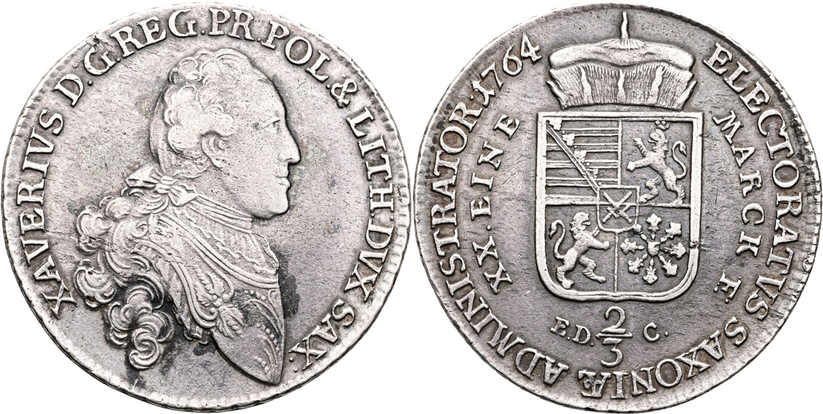 TYSKLAND/GERMANY. SACHSEN. Friedrich August III (1763-1806). 2/3 taler 1764. KM 973. 13,92 g. Gniden/fläckig. Rubbed/spotted.
