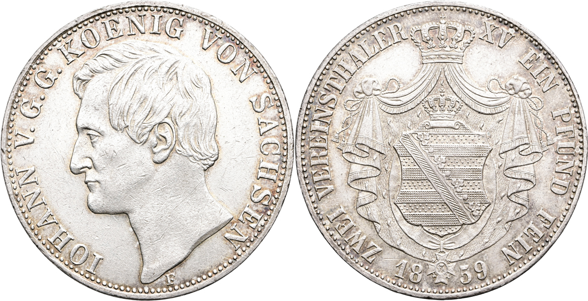 TYSKLAND/GERMANY. SACHSEN. Johann I (1854-1873). 2 taler 1859. Dav. 889. 36,97 g. Obetydliga kanthack. Insignificant edge nicks.