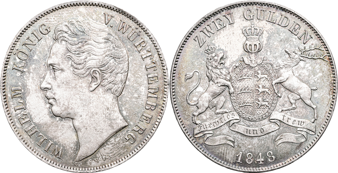 TYSKLAND/GERMANY. WÜRTTEMBERG. Wilhelm I (1816-1864). 2 gulden 1848. KM 595. 21,21 g.
