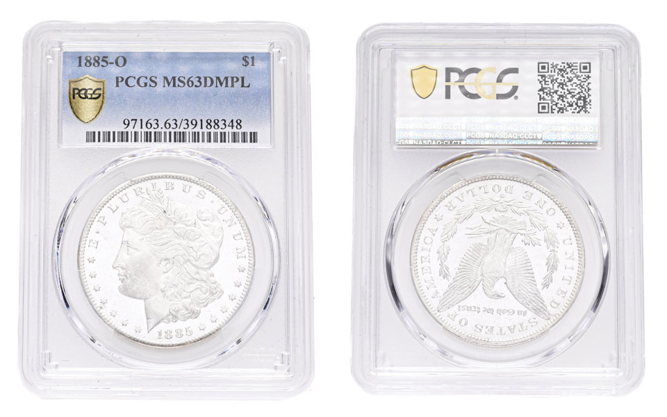 USA. Dollar 1885. KM 110. Hanteringsmärken. Rengjord. Präglingslyster. Bag marks. Cleaned. Mint lustre. I PCGS-kassett (97163.63/39188348) graderad MS 63DMPL.