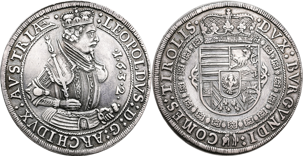 ÖSTERRIKE/AUSTRIA. Leopold V (1619-1632). Taler 1632. Dav. 3338. 28,37 g. Uppgraverad. Gniden. Tooled. Rubbed.