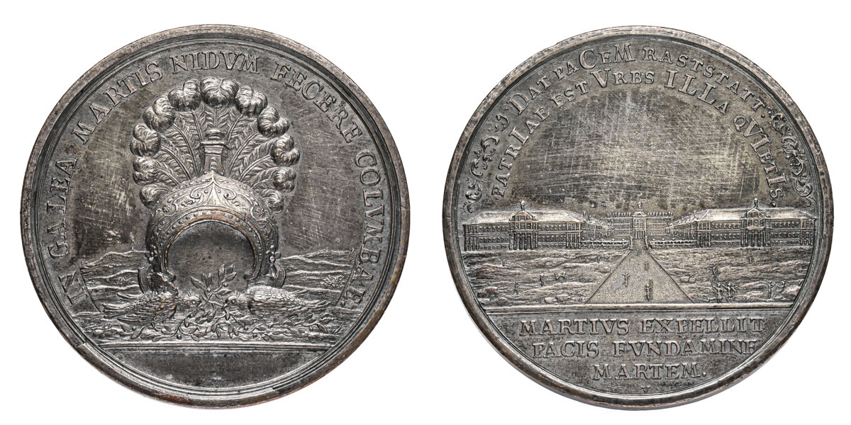 ÖSTERRIKE/AUSTRIA. Karl VI (1711-1740). Freden i Rastatt 1714. Av G. W. Vestner. Försilvrad koppar. 54,88 g. Uppgraverad. Tooled.