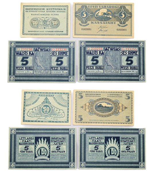 LETTLAND/LATVIA. 5 rubel 1919 (2 ex, ocirkulerade, kvalitet 0). ESTLAND/ESTONIA. 5 marka 1919 (kvalitet 1+), 50 penni 1919 (kvalitet 1+/01). Totalt 4 ex.