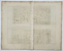 "Jupiter et Autres Dieux" illustrates two distinct friezes of classical deities rendered in the style of ancient Roman bas-reliefs. The upper register depicts a group including a seated Jupiter with his eagle, Juno, and Mercury carrying his caduceus, accompanied by a ram. The lower register displays five standing and seated figures including Neptune with his trident and other mythological figures holding various symbolic attributes. The engraving documents significant archaeological sculptures and monumental reliefs found across Europe, providing a systematic visual record of classical iconography. This work is from L’antiquité expliquée et représentée en figures, published in Paris in 1719, which served as the first comprehensive attempt to catalog and illustrate the physical remains of the ancient world.