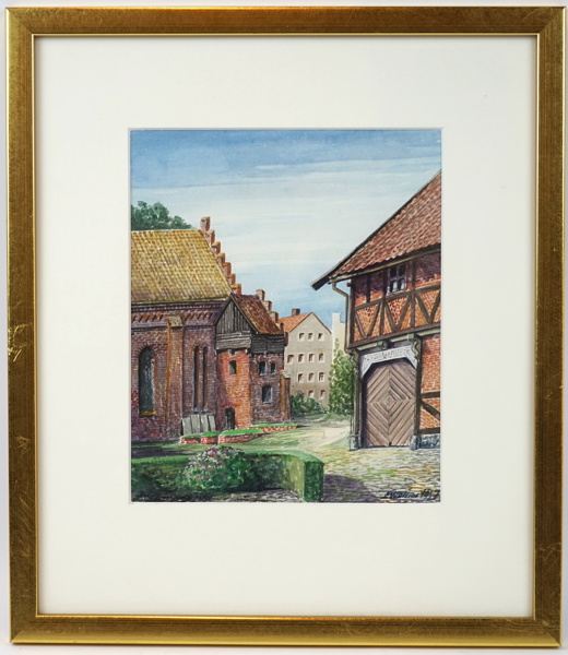 Auktioner Konst & Grafik Edward Wollin, ''Motiv från Gamla Ystad, Klostergården'', akvarell, signerad, 1957.