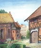 Bilder Edward Wollin, ''Motiv från Gamla Ystad, Klostergården'', akvarell, signerad, 1957.