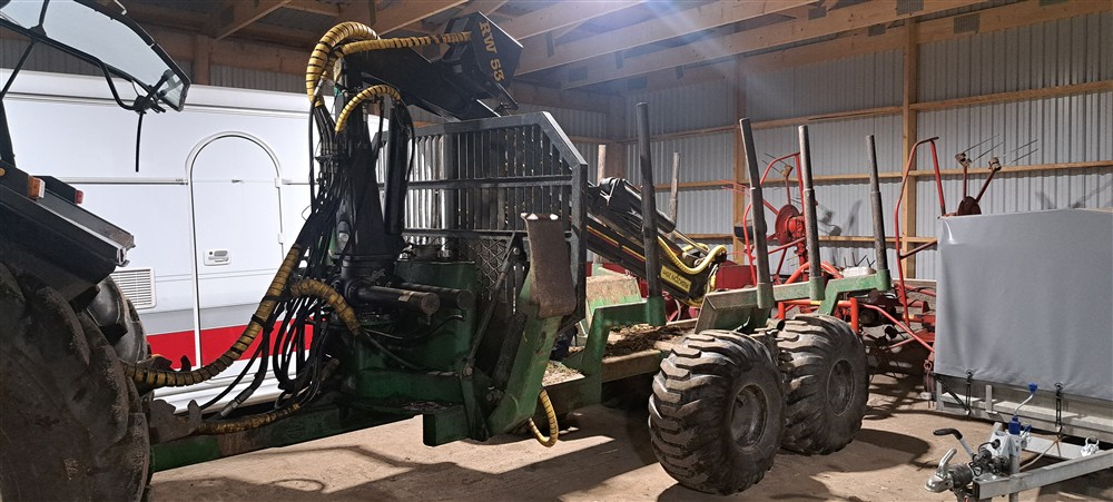 Farma 12 t, 4 bankar, drivning på boggie, hydrauliskt skutbar ram, vinsch, eget hydraulsystem.