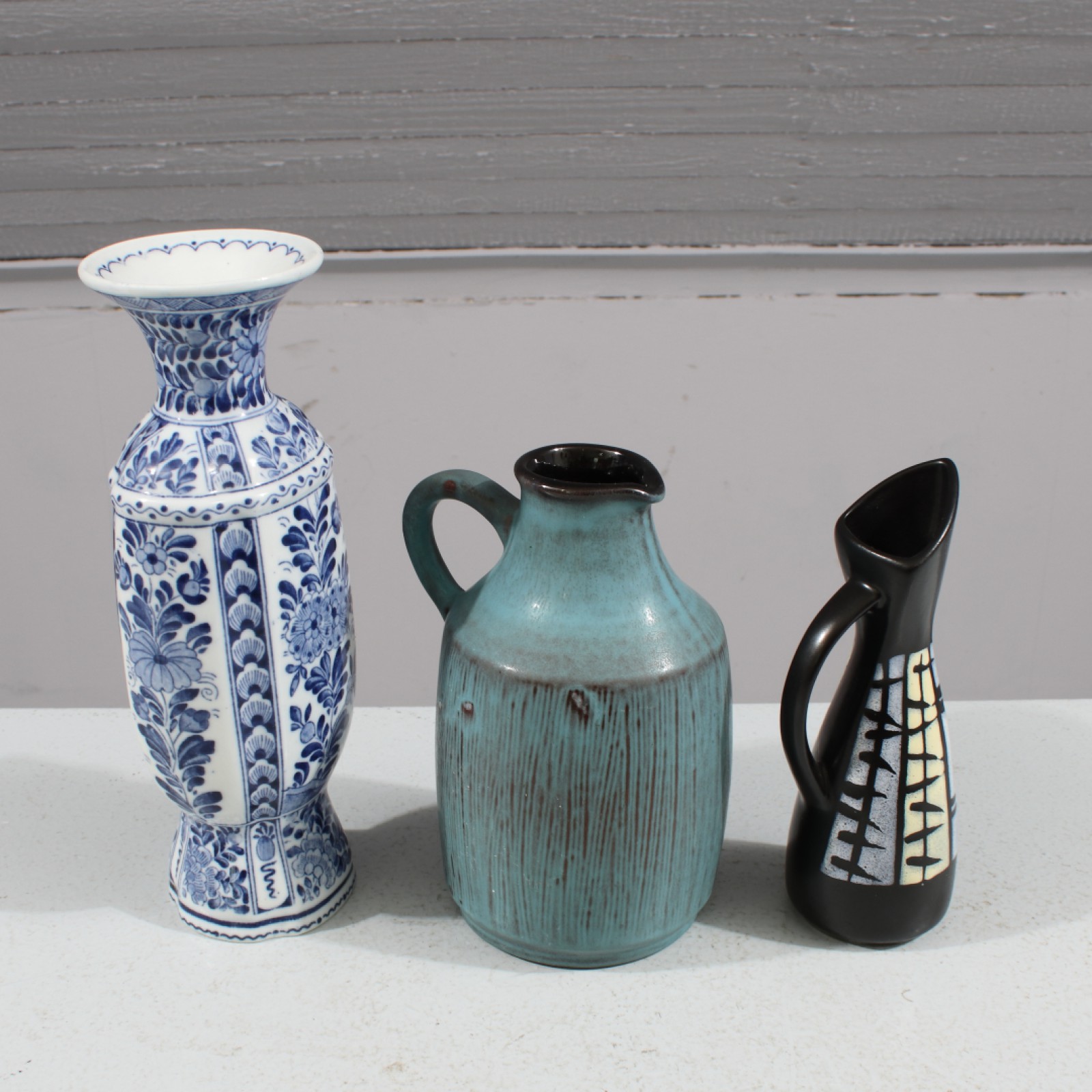 3 delar, 1st Rörstrand kanna/hänkelvas, 1st Delft vas, samt 1st omärkt kanna/hänkelvas, höjd 18,5-26 cm. (vån3)