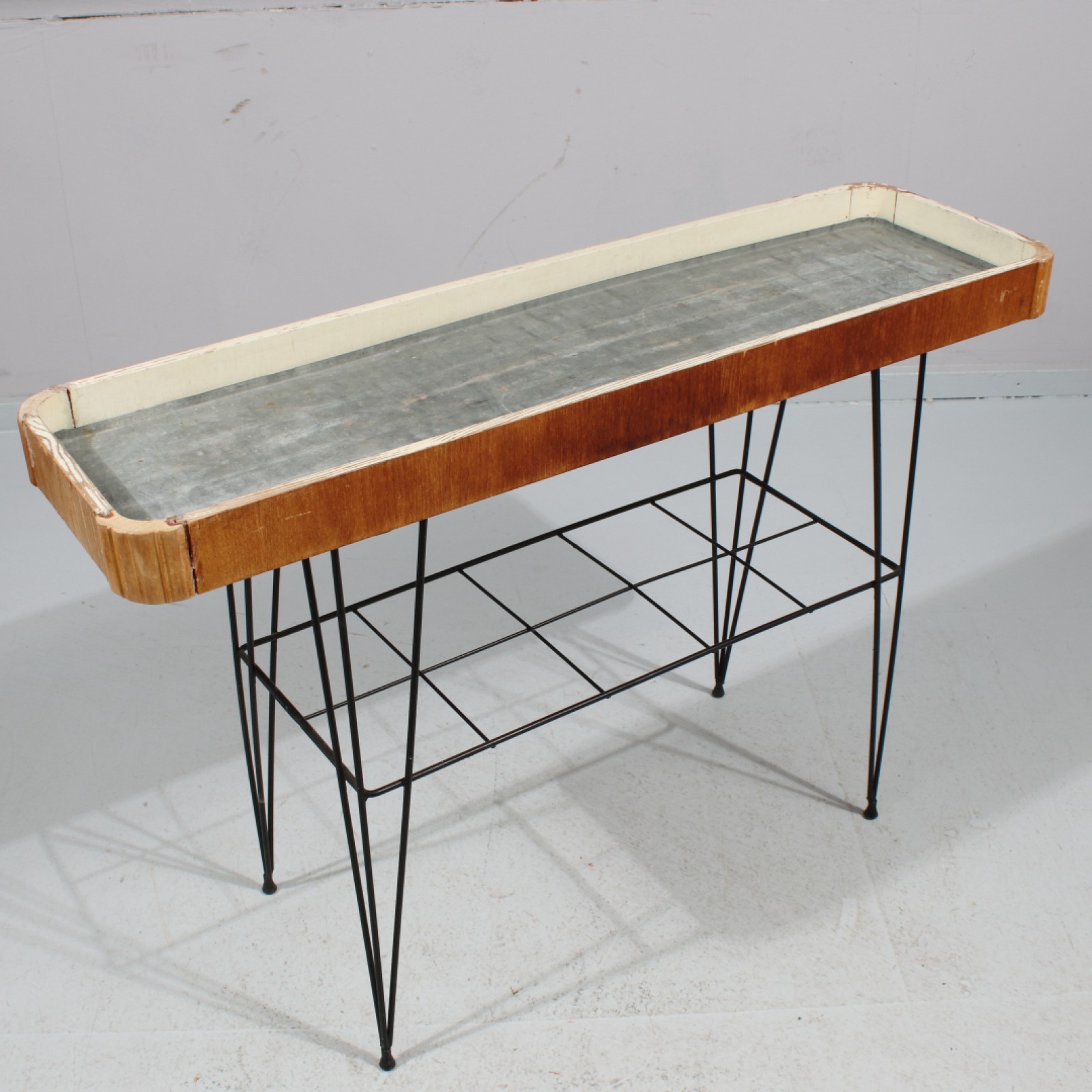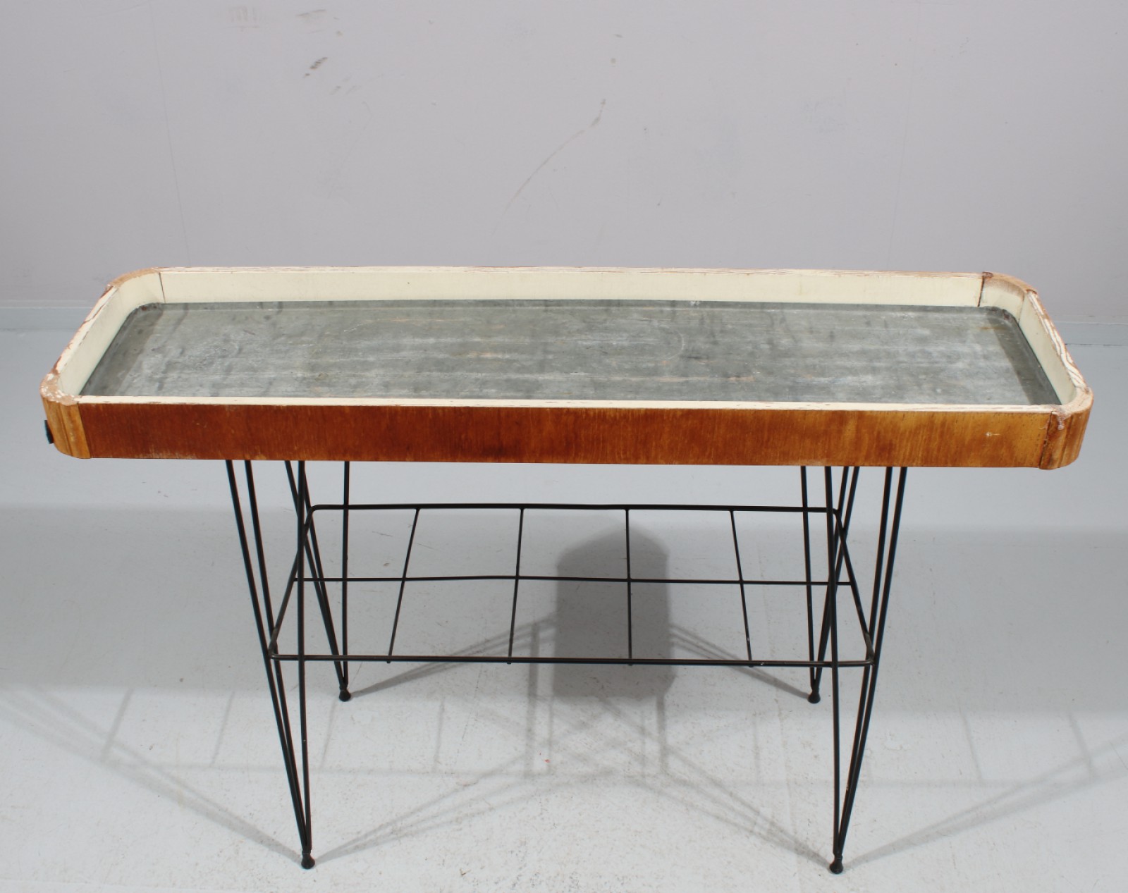 Stomme i plastad metall, låda fanerad med teak, 1950,60-tal, åldersrelaterat slitage, H.57, B.87, Dj.26 cm (vån3)