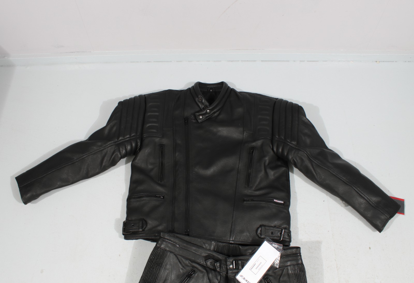 2 delar, läder, oanvända i nyskick, jacka strl:XL, byxor strl:2X. (vån3)