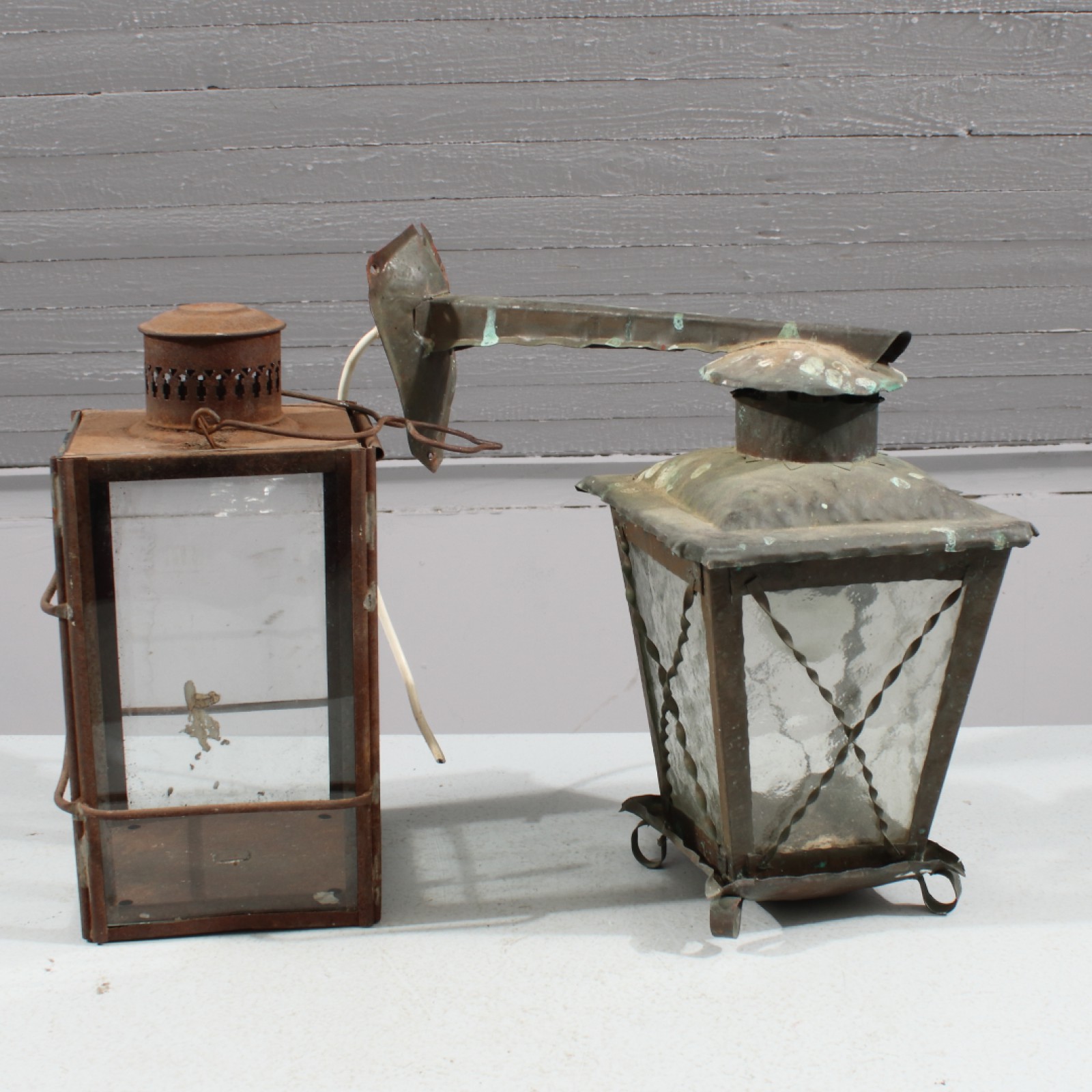 2 delar, vägglampa i koppar och glas, ljuslukta i plåt och glas, 1900-tal, lampa med ärgad koppar, ljuslykta med ytrost, vägglampa H.31, B.25, Dj.34 cm, ljuslykta H.29, B.14x14 cm. (vån3)