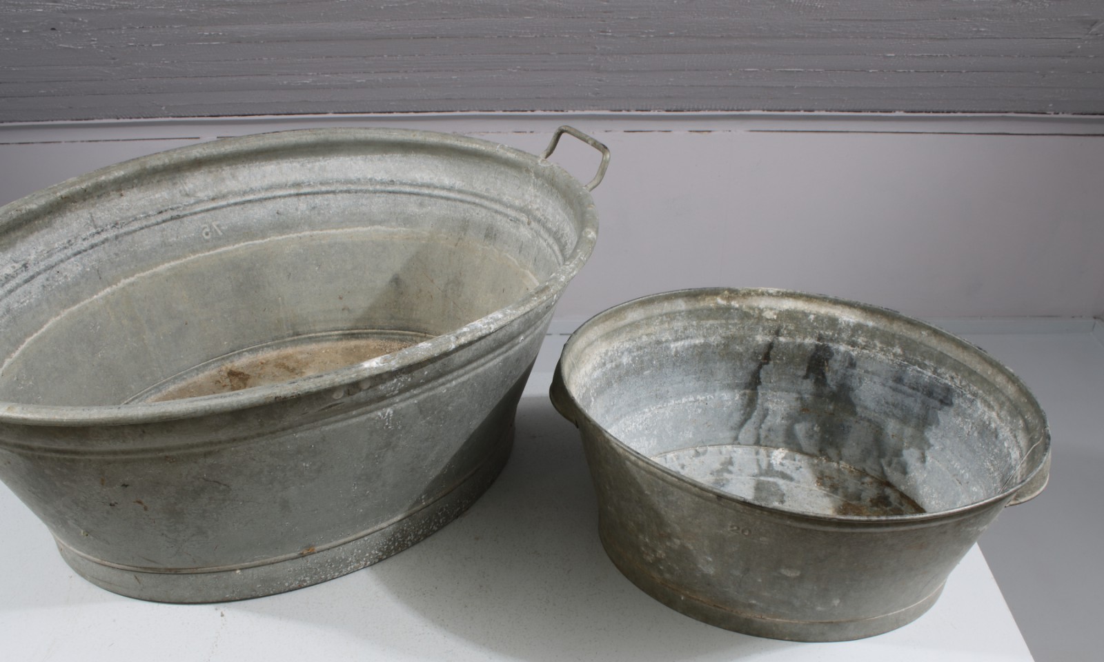 2 stycken, 1st 20 lit samt 1st 75 lit, höjd 22-32 cm, mynning 49,5x39,5 samt 76x61 cm. (vån2)