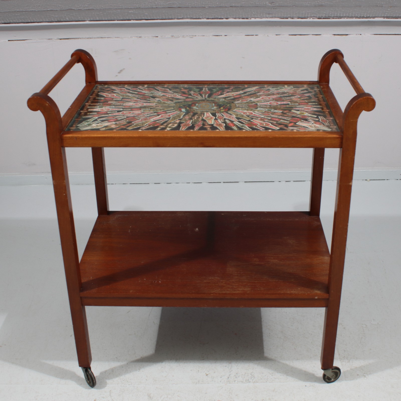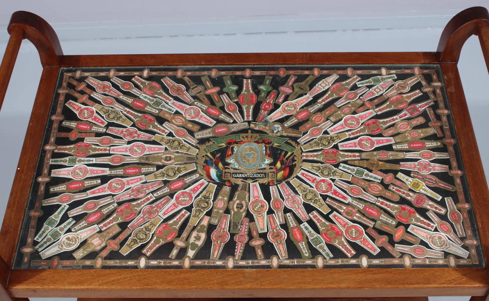 Lövträ, skiva i glas, dekor under glasskiva med cigarrgördlar, H.74, L.68, B.40 cm. (vån3)