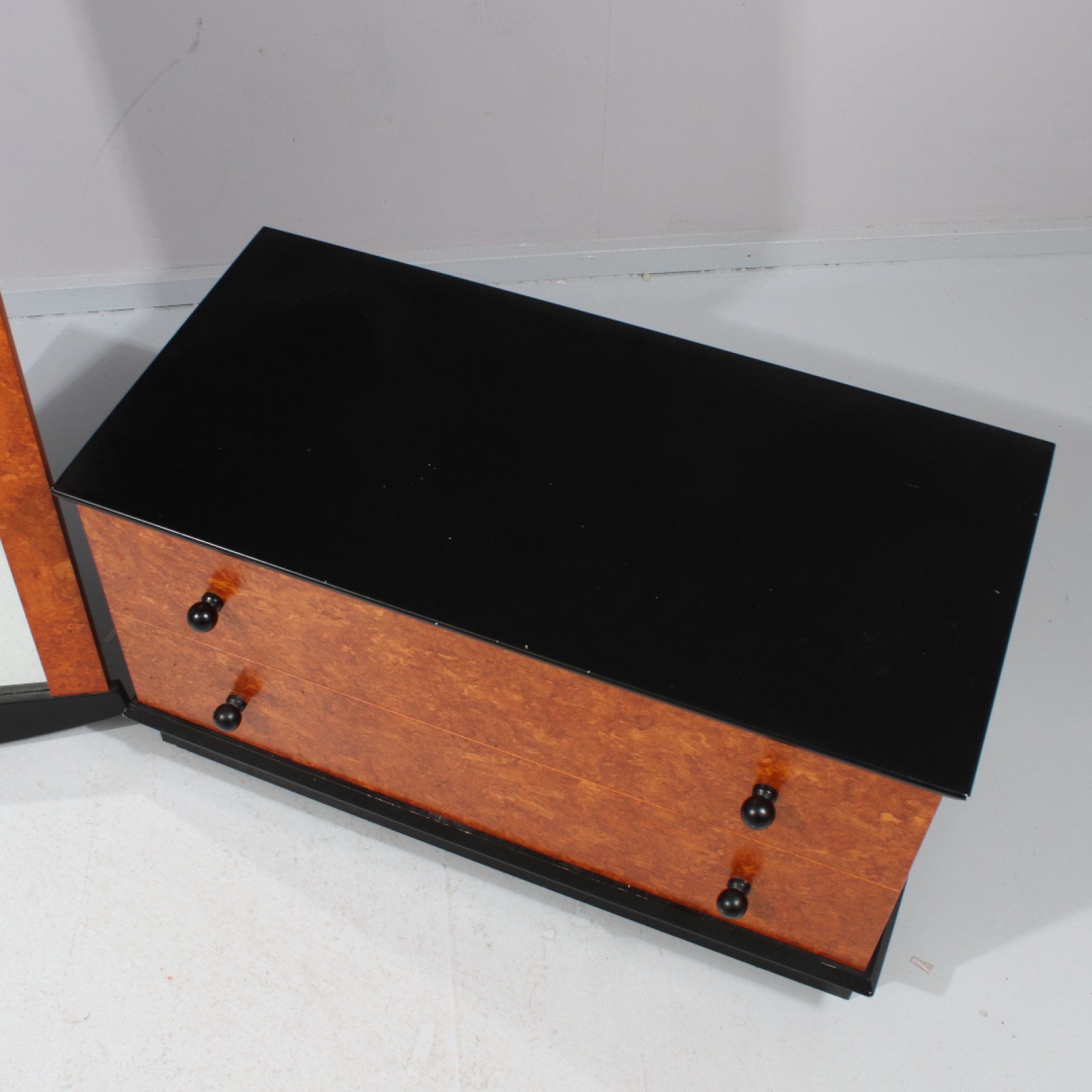 2 delar, svartlackat trä samt fanér, 19,2000-tal, skiva med några repor, byrå H.42, B.77, Dj.38 cm, spegel 117x60 cm. (vån3)