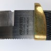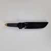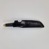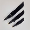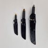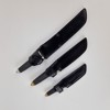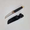 Japantillverkade. Blad i rostfritt stål, 400-serien. Svart handtag i rutat Kray-Ex. Slida i läder.