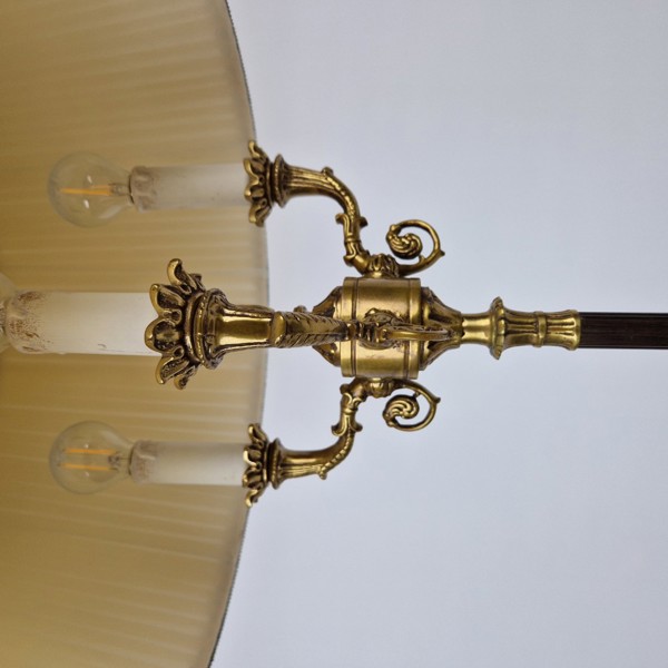 Metall och mässing med textilskärm. 1900-tal. Tre ljusarmar med vardera ljuspunkt.