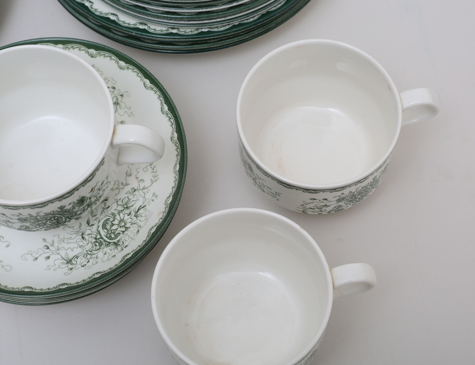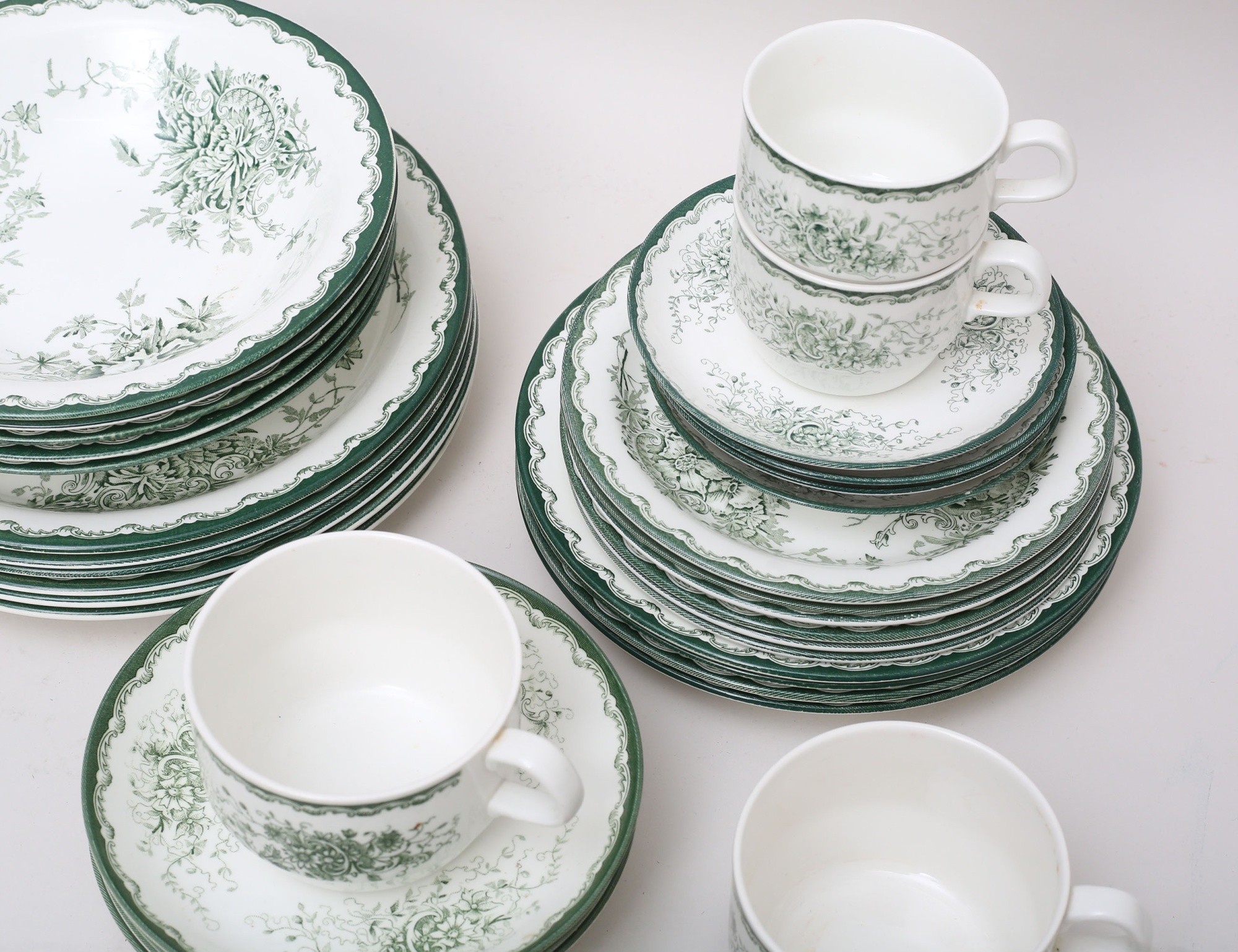 6 mattallrikar, 5 djupa, 6+4 assietter, 3 tekoppar med fat, 2 kaffekoppar med fat, kopparnas diameter 8/9, diameter 17,5-23,5 (tekoppar med smärre missfärgning) (26)