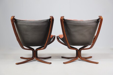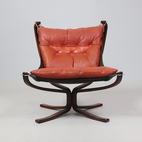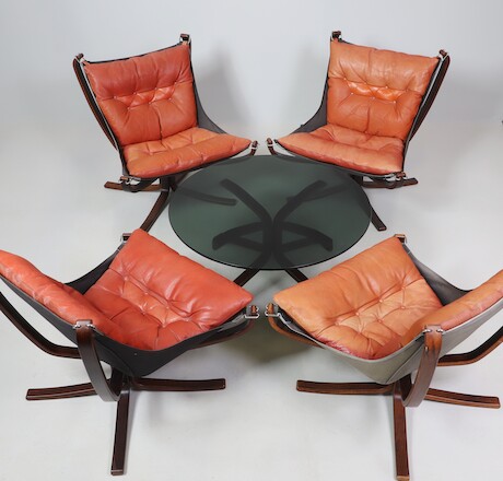 Sigurd Ressel, sittgrupp "falcon" Vatne möbler Norge 1970-tal, bord med glasskiva D=90 H=46 + 4st fåtöljer