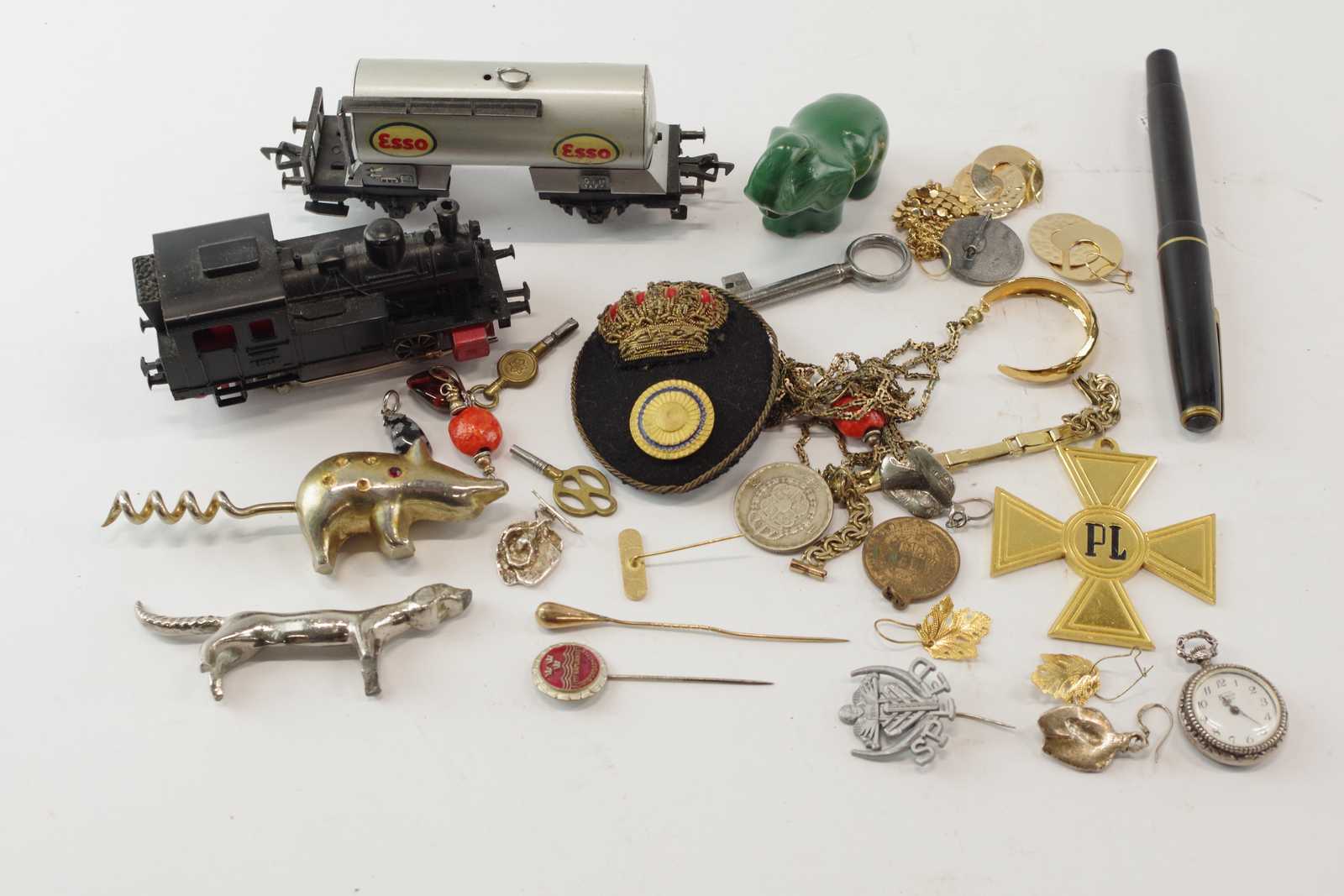 Bilder TRÄSKRIN antikt med innehåll Bl.a Lok Märklin, silverörhängen, smörhund