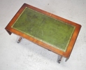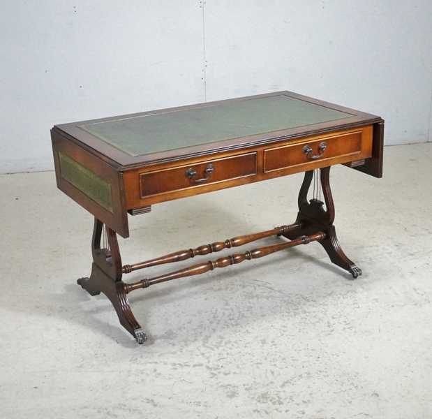 skinninlagd skiva, mahogny, lyrfomade kopplade ben med hjultrissor, 2 lådor i sargen