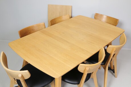 Matgrupp ek, bord 150 X 90 + ilägg a45 H=74 och 6 stolar