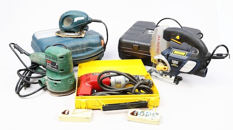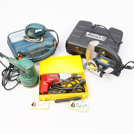 Auktioner Bygg & Trädgård Excenterslip Bosch, Slipmaskin Black Decker Mouse med tillbehör, Borrmaskin Perless och Sticksåg Mc Alister med Laser