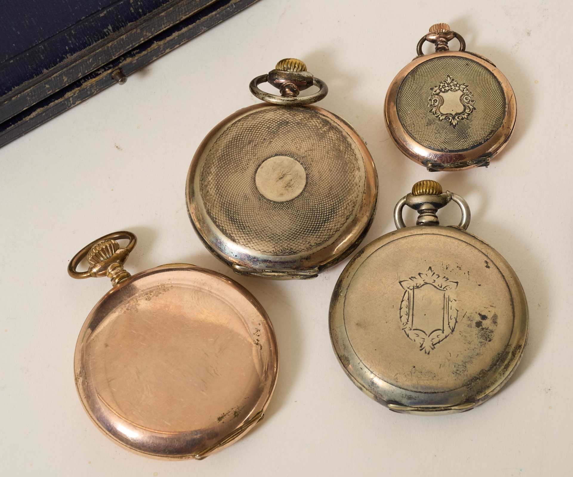 2 st fickur i silver, en savonett i gulddouble (saknar glas), samt mormorsur, bruksslitage, ej funktionstestade