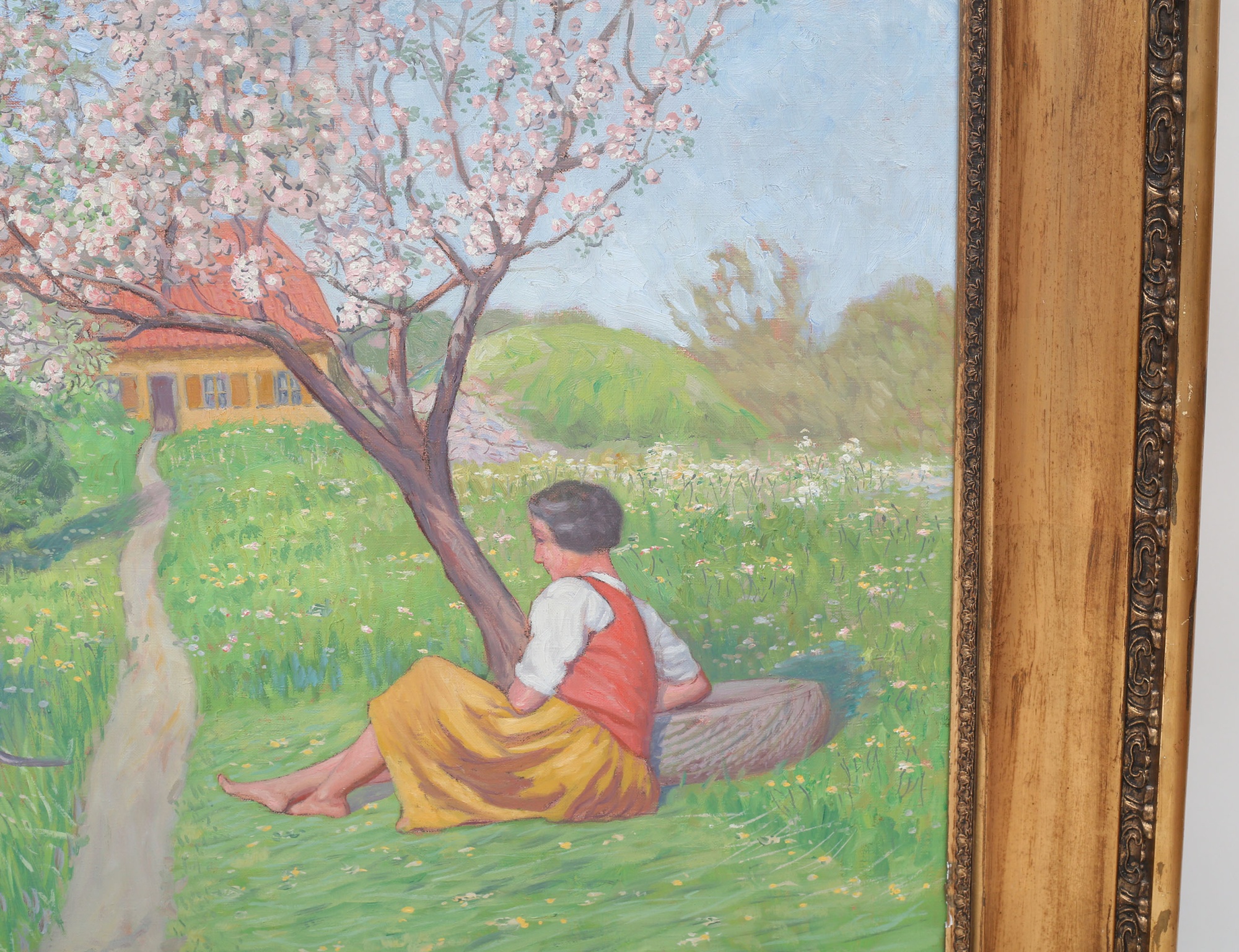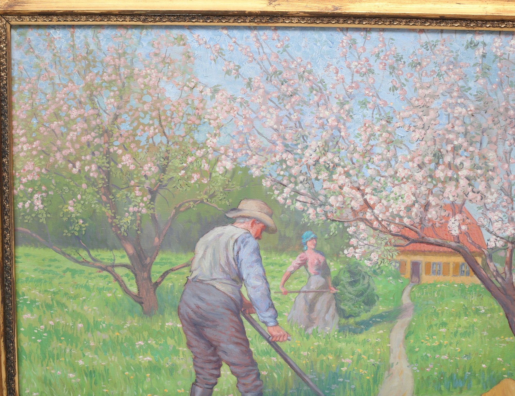 oljemålning på duk, nationalromantiskt motiv med blommande äppelträd, signerad Grisslehamn 1917, 82x109, rammått 105x135