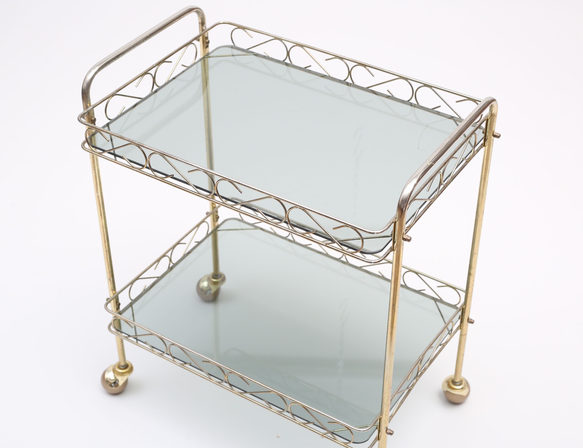 stomme i mässing, två röktonade glasskivor, på hjul, höjd 65, bredd 53 (smärre bruksslitage)