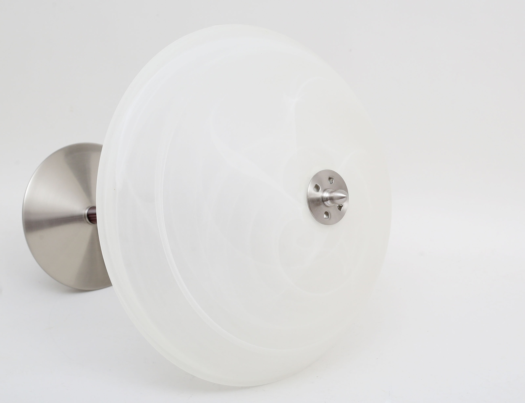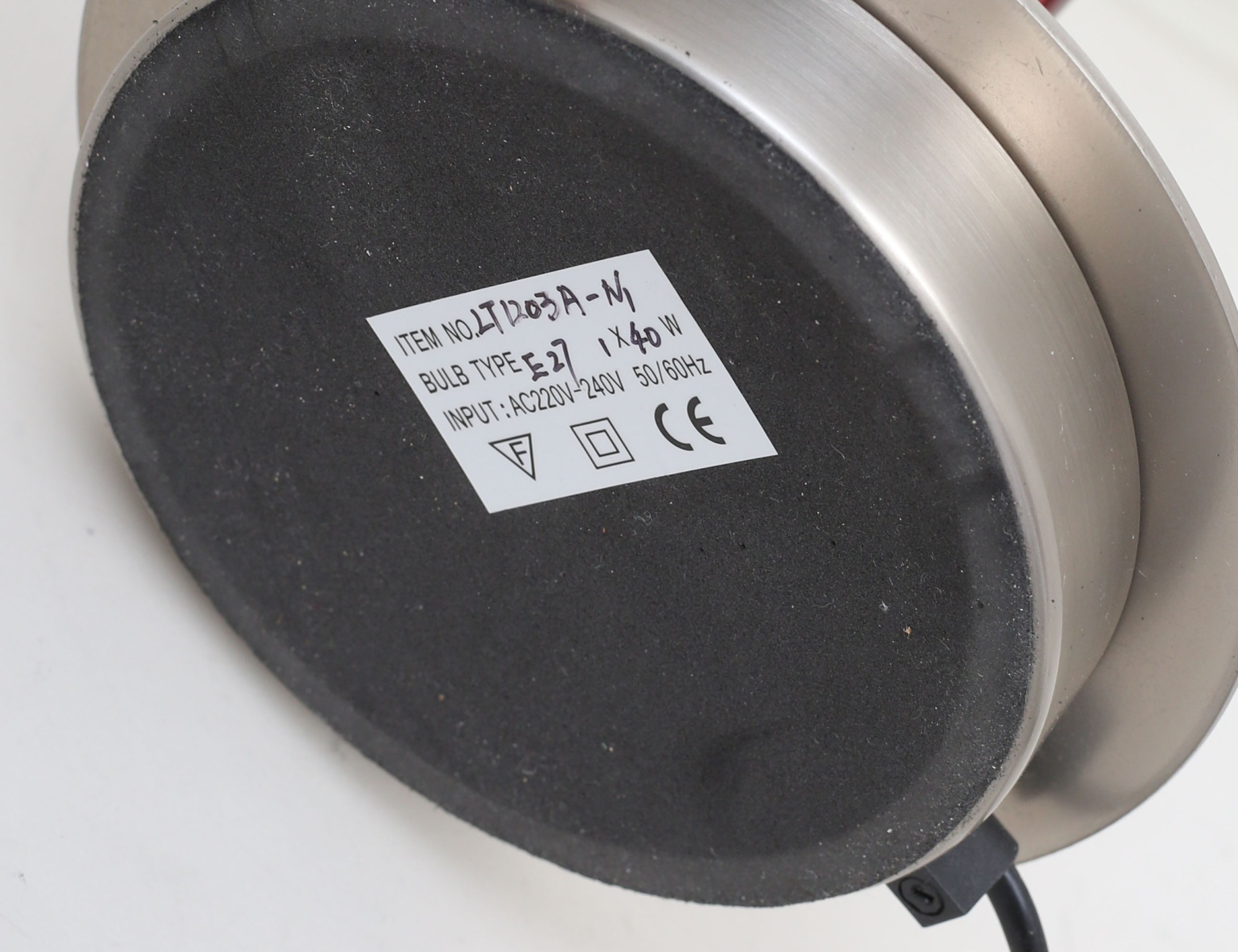 borstat stål, stam i mörkbetsat trä, kupa i gjutet matterat glas, höjd 48
