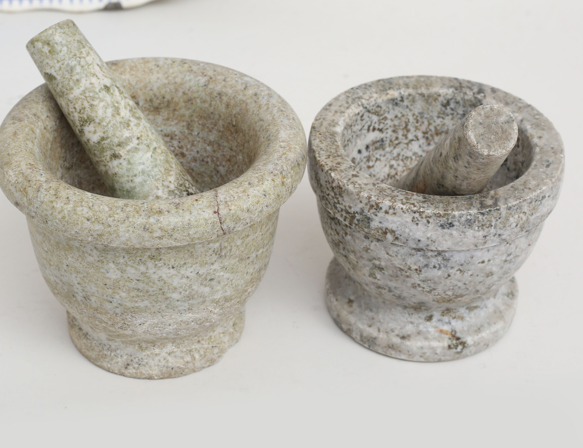 blåvit underglasyrdekor, 44x35, 2 mortlar 1900-talets första hälft, marmor, höjd 10/11,5 (en med spricka/nagg) (3)