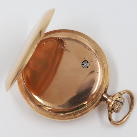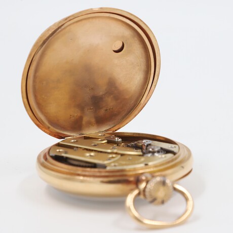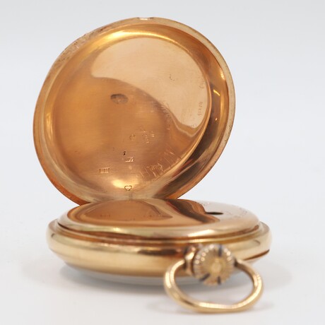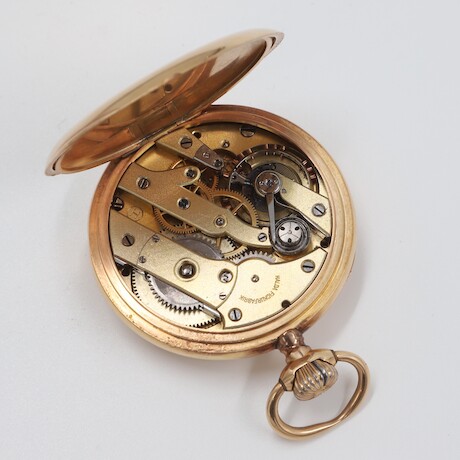 Auktioner Klockor & Ur Fickur, Halda, guld 18 K, D = 50 mm, H-verk, tot V = 97,5 g + chatelain gulddoublé och textil