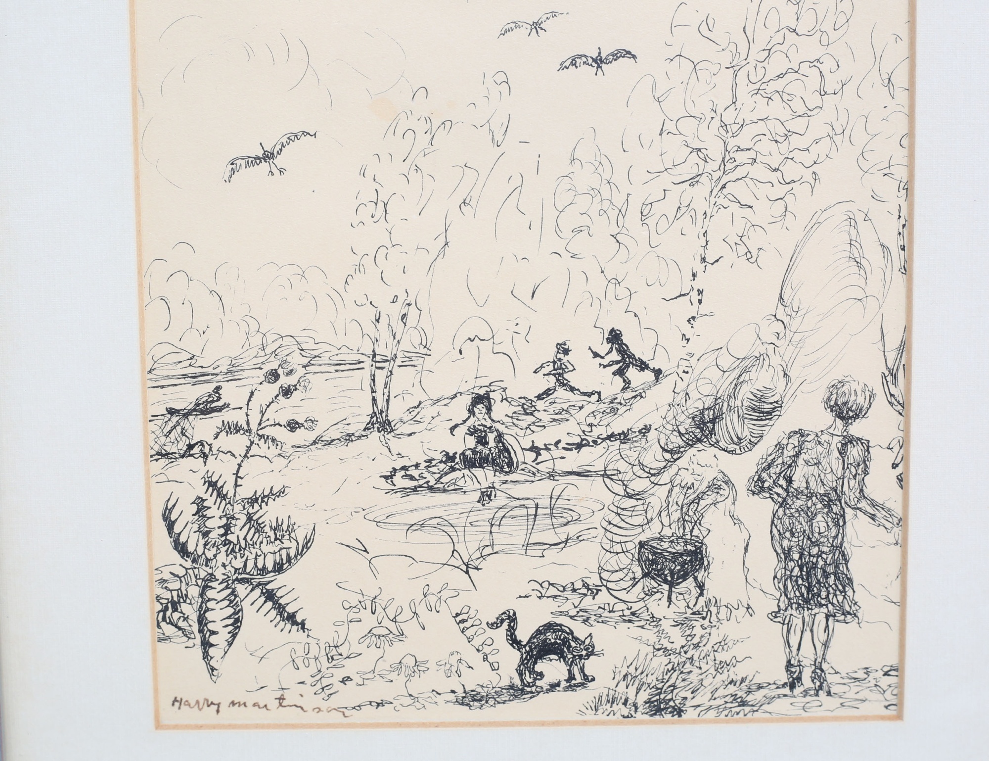 tuschteckning, landskap med figurer och katt, signerad, atergo dedikation
