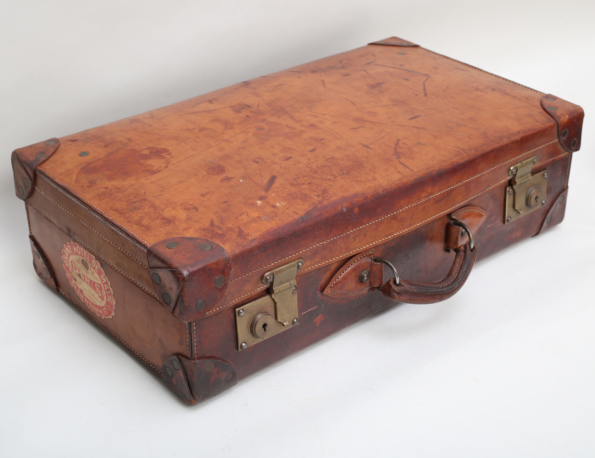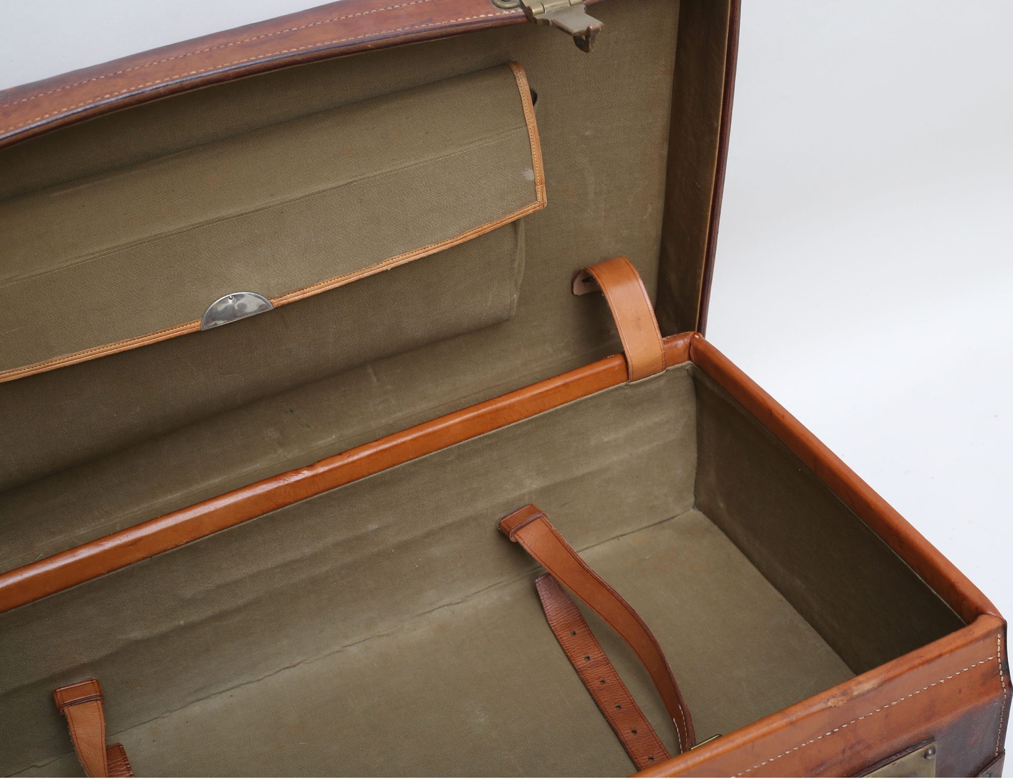 ull, etikettmärkt Habo, 200x130, resväska 1900-talets första hälft, läder, lås i mässing, invändig klädd i canvas och remmar, etiketter från Paris, 63x35 (2)