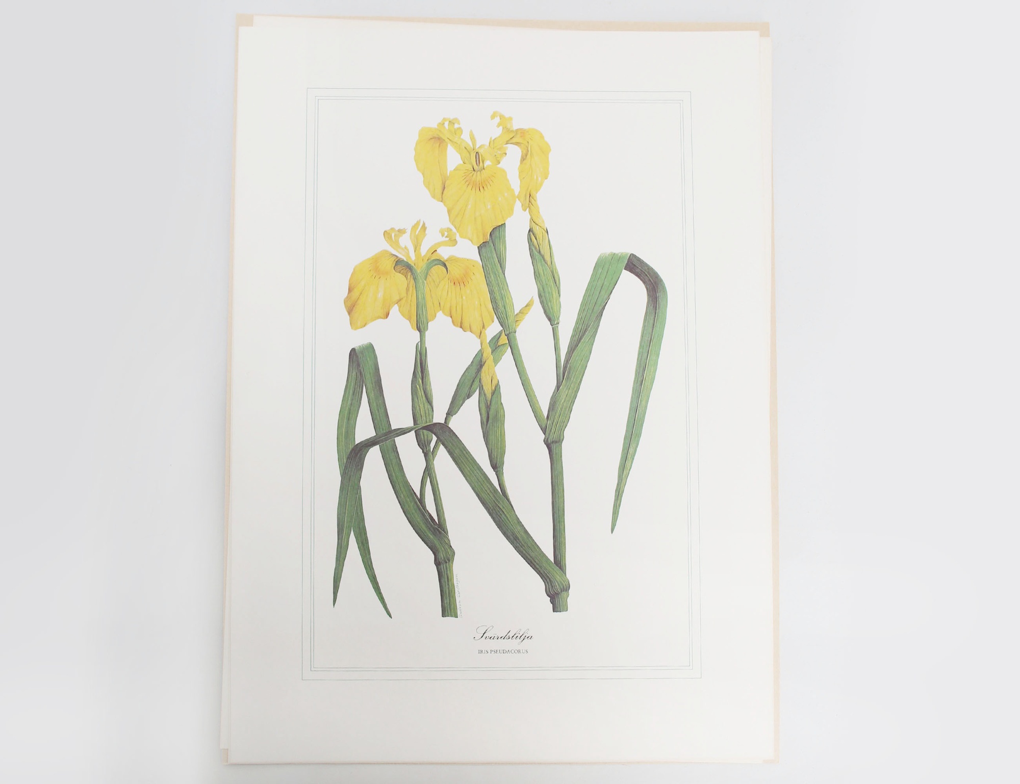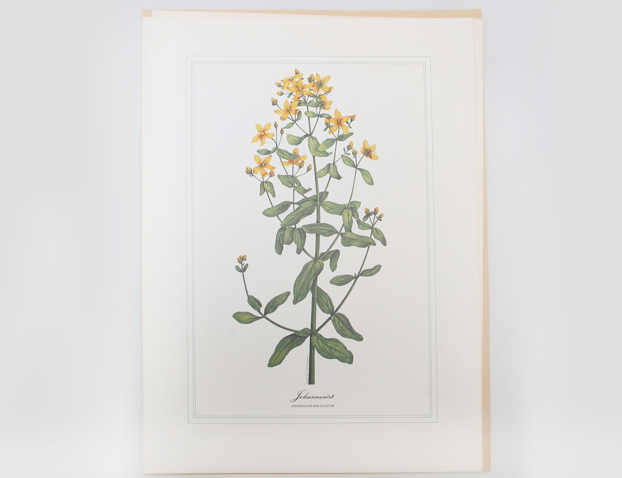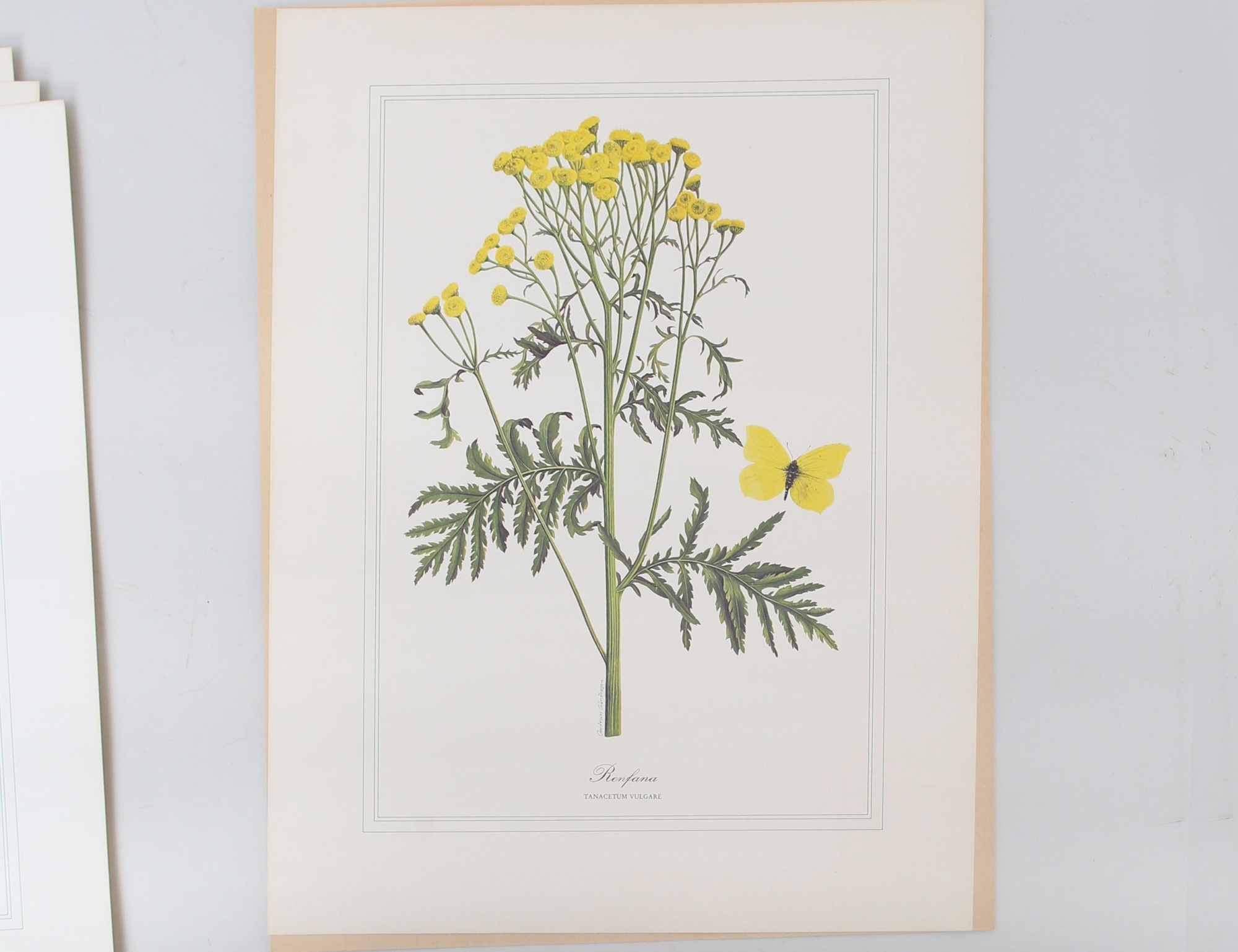 12 blad varav 3 stycken "Johannesört", 3 "Renfana", 3 "Kabbeleka" samt 3 "Svärdslilja", gåvomappar från sparbanken "Fyra blommor i färg", 43x33