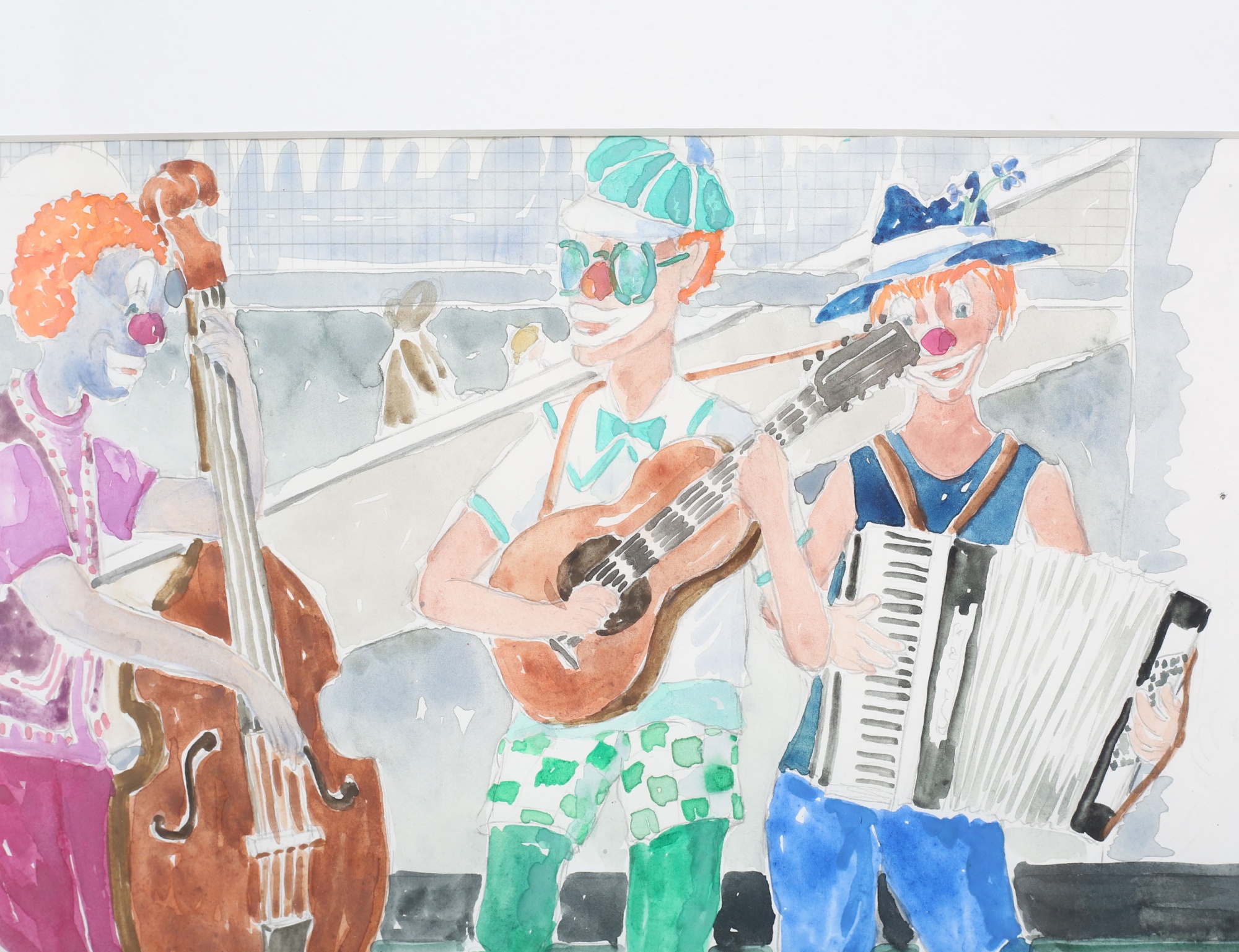 akvarell, clownorkester, signerad, 27x39, rammått 46x55