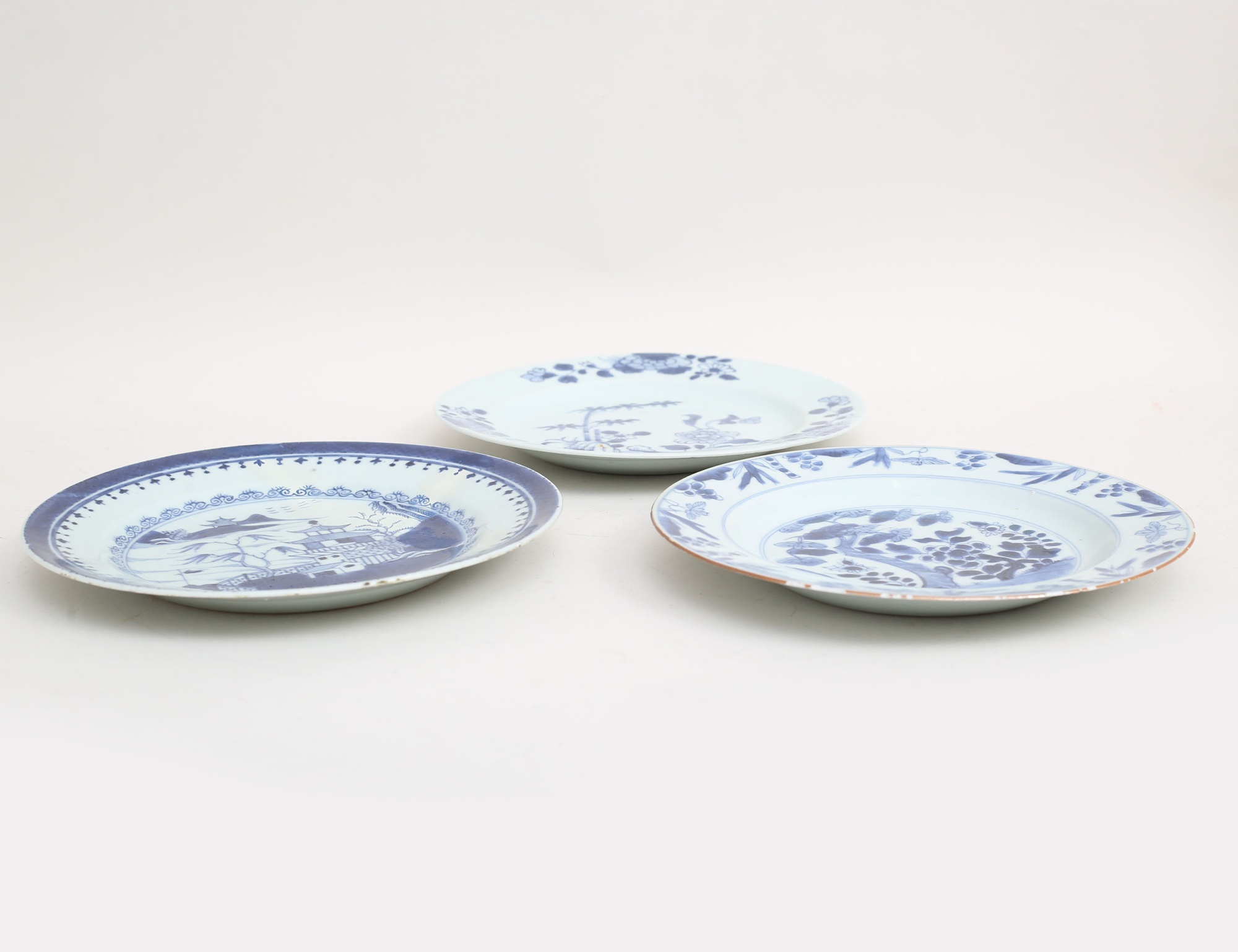 Qianlong 1736-1795, blåvit underglasyrdekor, diameter 22,5/23 (två med lagningar, en med kantnaggar)