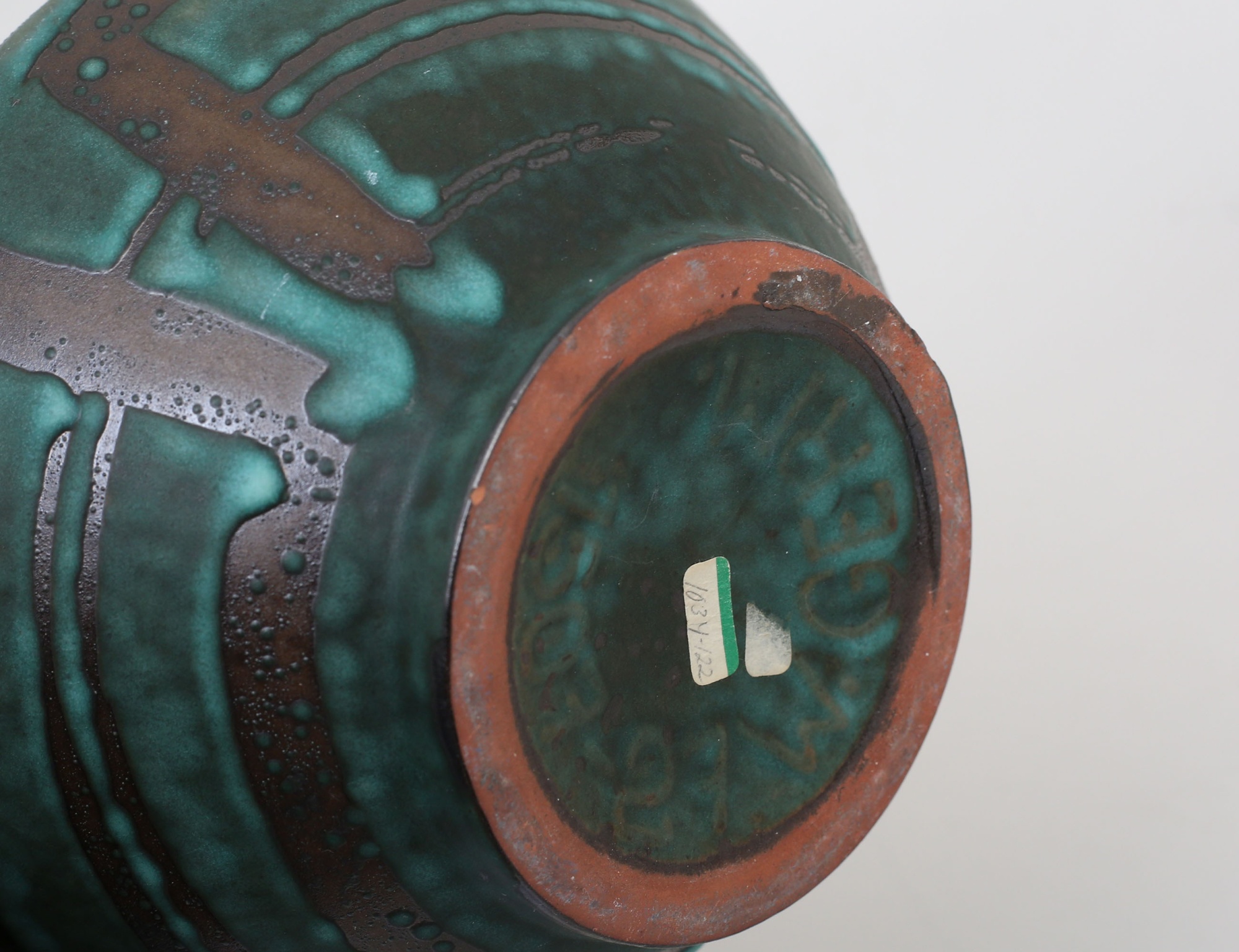 märkt Schott & Gen Jena, glas, höjd 32, hänkelvas Tyskland, grönglaserad keramik, höjd 26,5 (2)