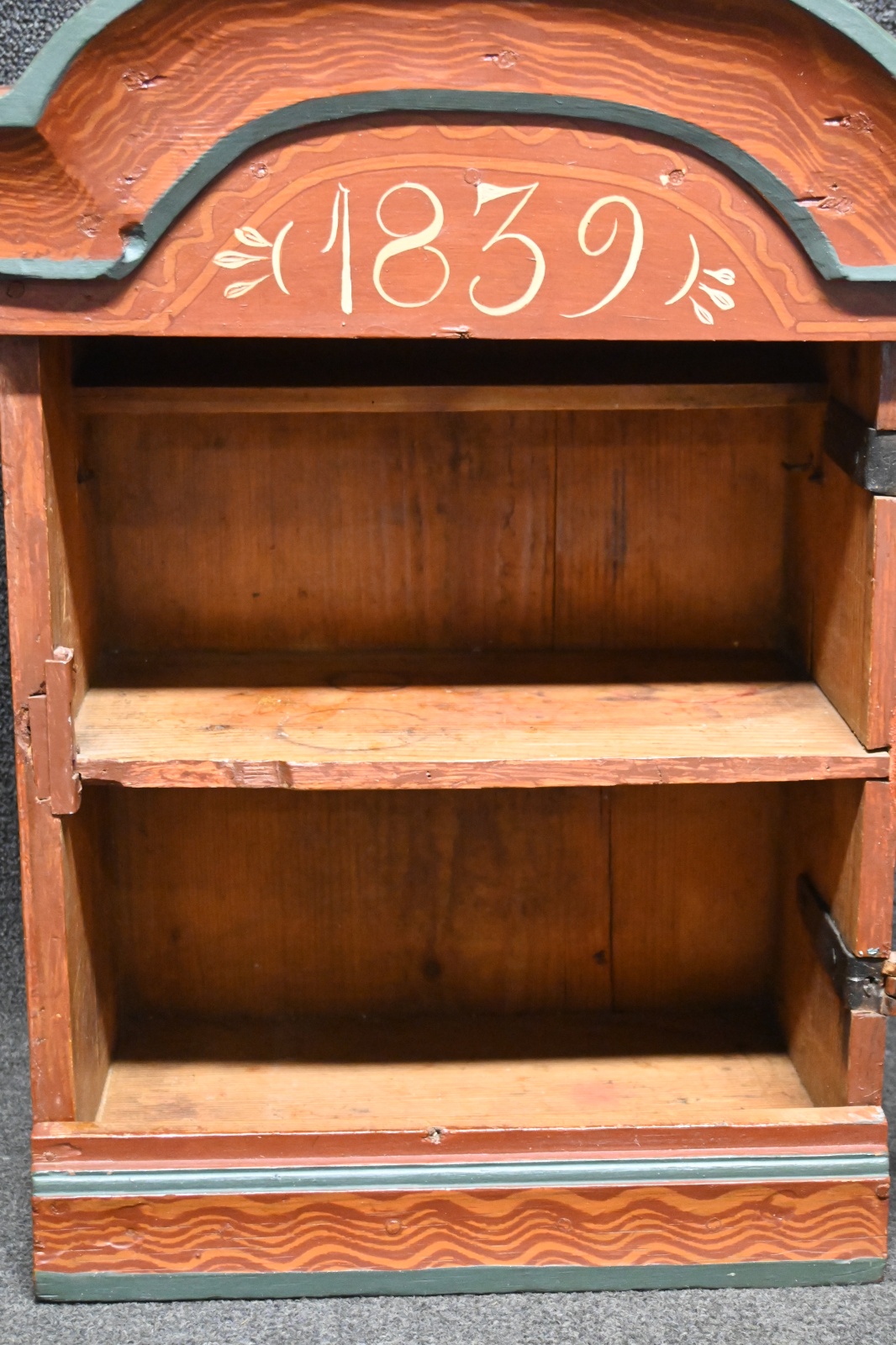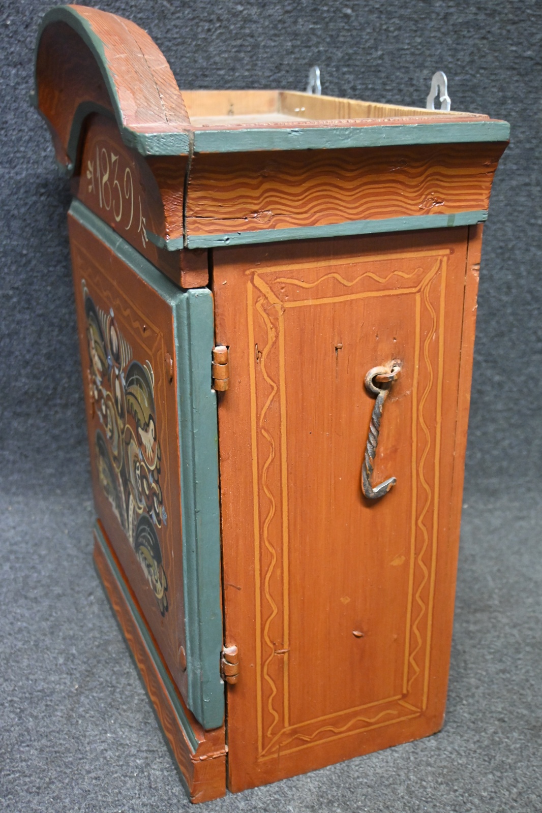 Brännvinsskåp dat 1839, senare bemålad H.52.5cm B.38cm Dj.22.5cm