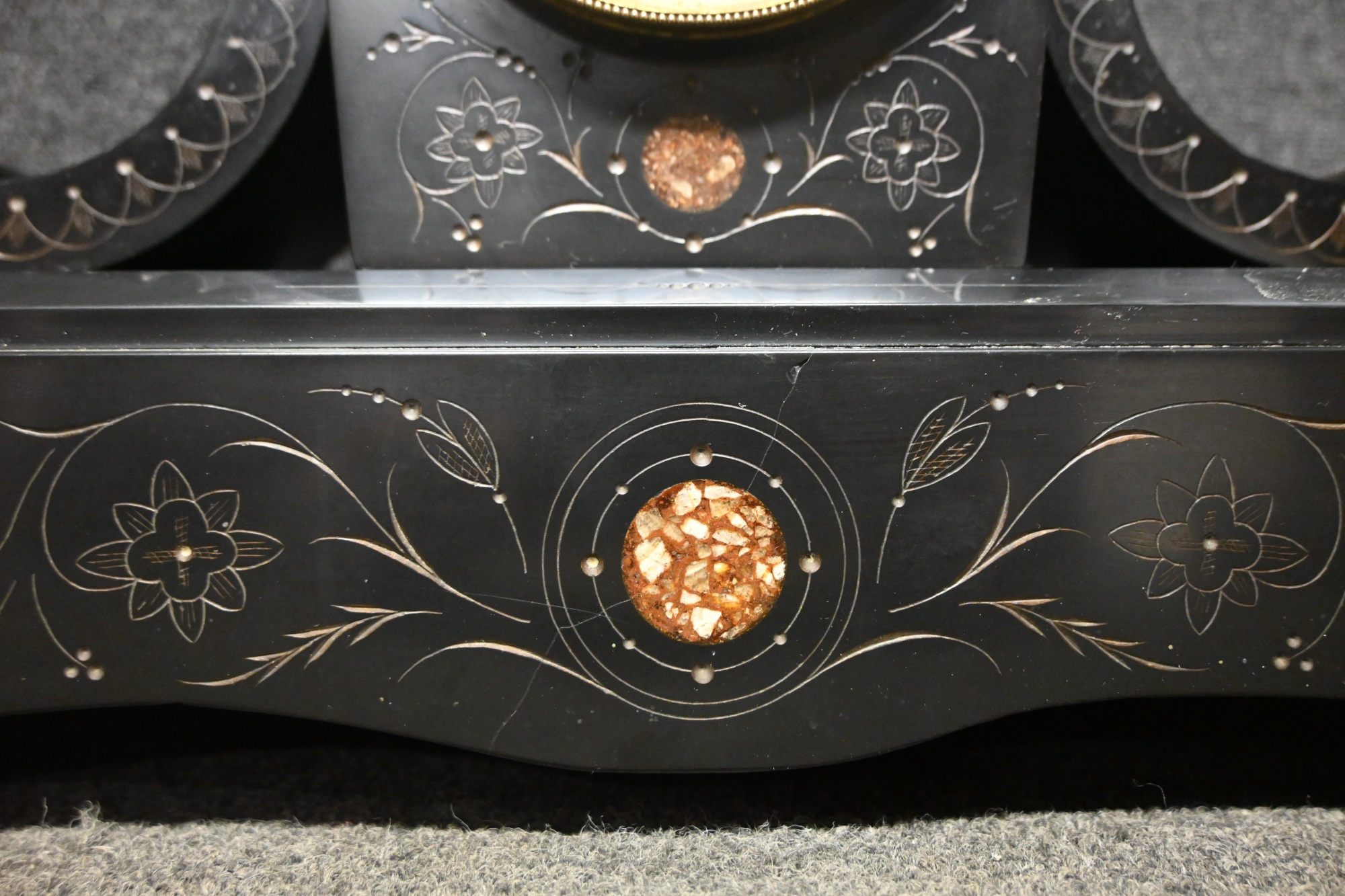 Bordspendyl i svart sten 1900.tal "Victoriansk stil" JH Leemans Bruxelles H.35cm B.43cm (pendel saknas)