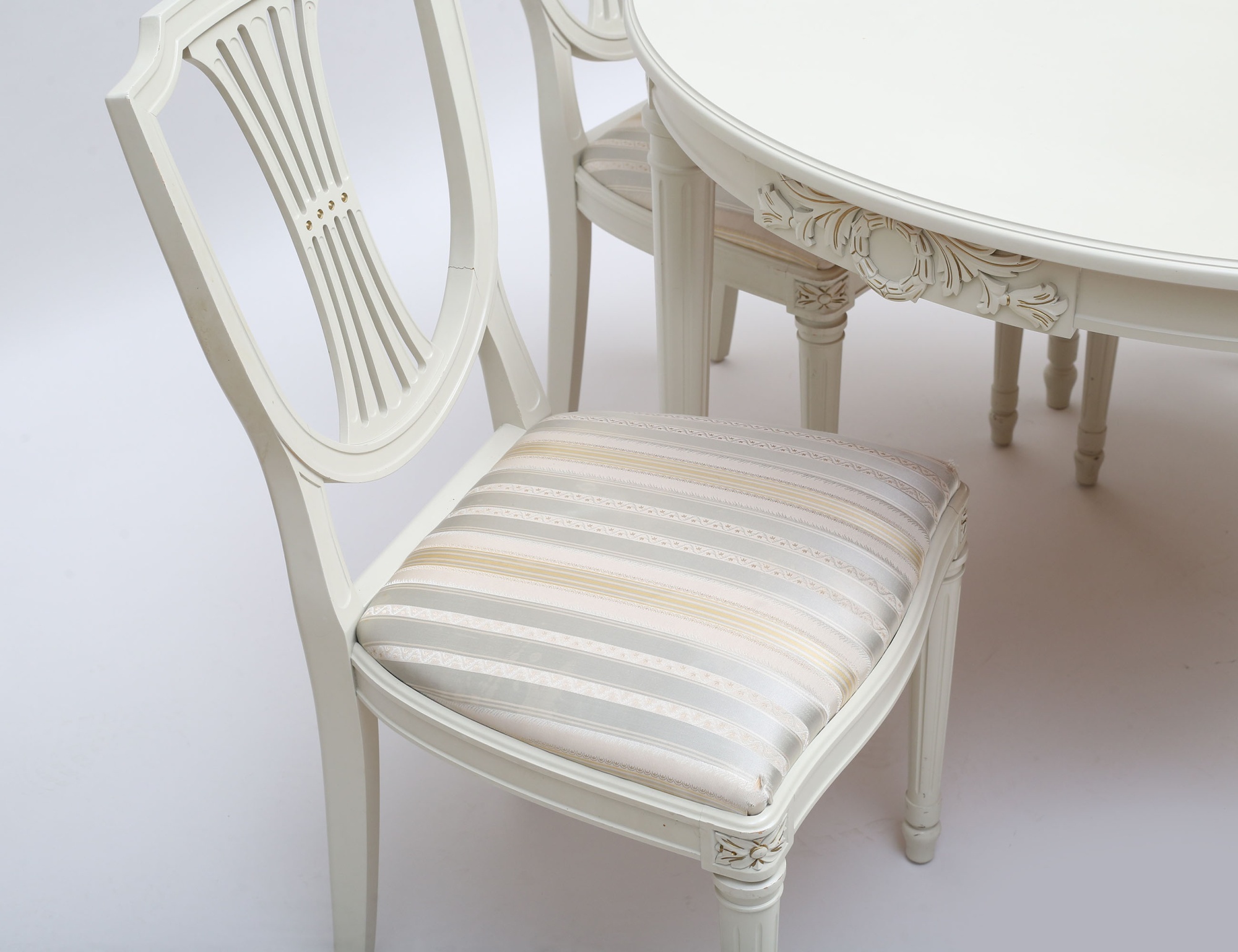 4 stolar samt bord, bemålad med förgyllda detaljer, två iläggsskivor, lösa stoppade sitsar, diameter 110, total längd (210) (smärre bruksslitage)